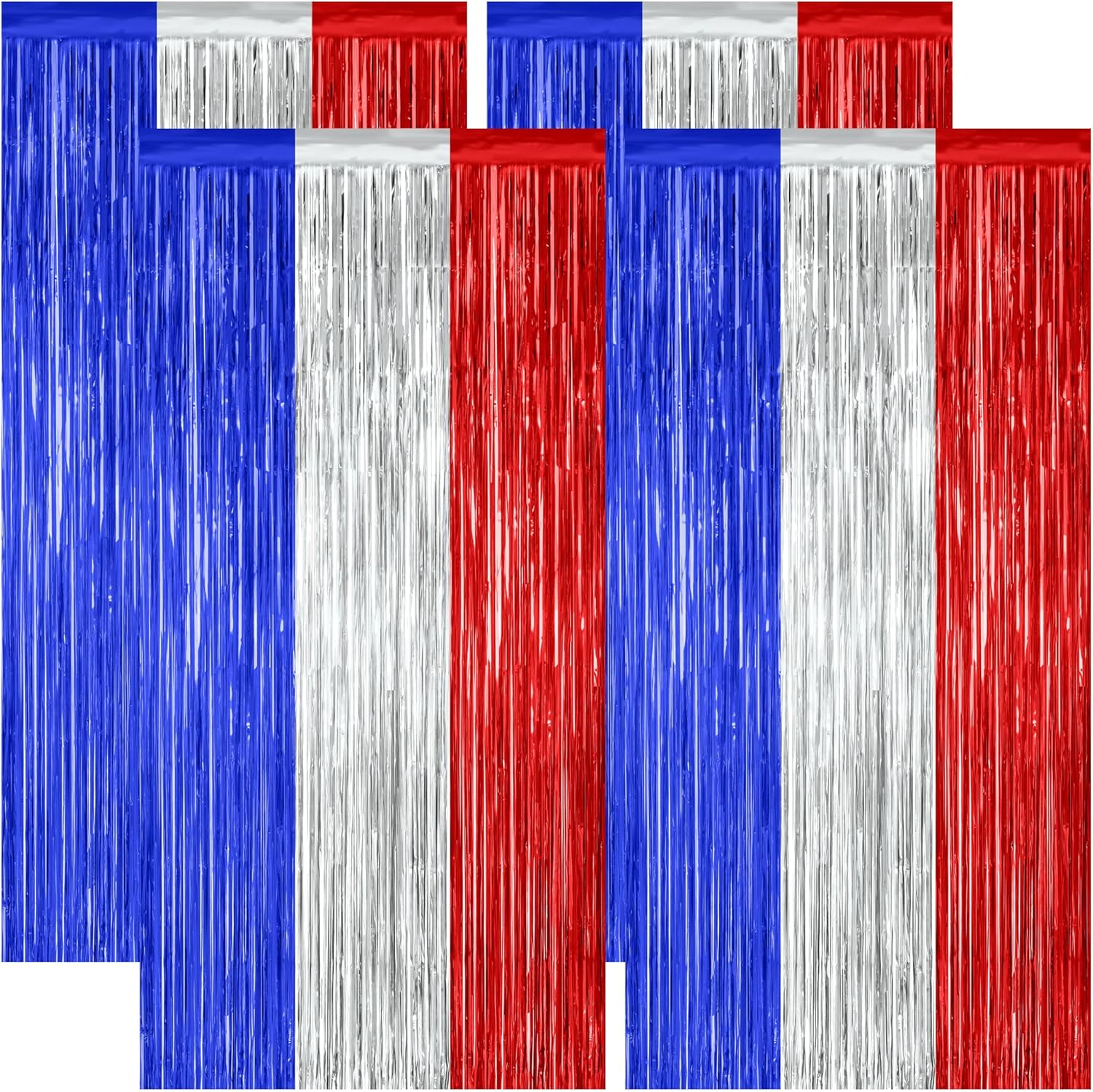 • Package Includes: This set includes 4 pcs patriotic style tinsel backdrop consisting of blue, silver and red colors, each measuring 3.28 x 7.05 feet and can be cut to your desired length.