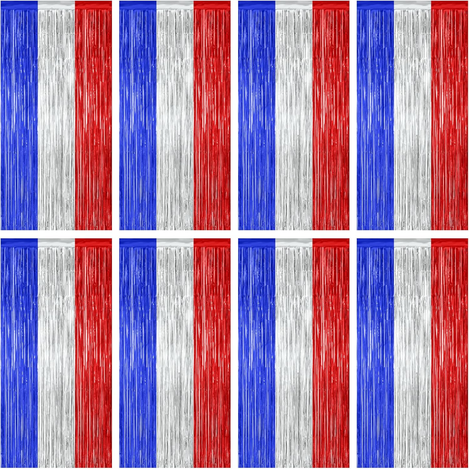 • Package Includes: This set includes 8 pcs patriotic style foil curtains consisting of blue, silver and red colors, each measuring 3.28 x 7.05 feet and can be cut to your desired length.