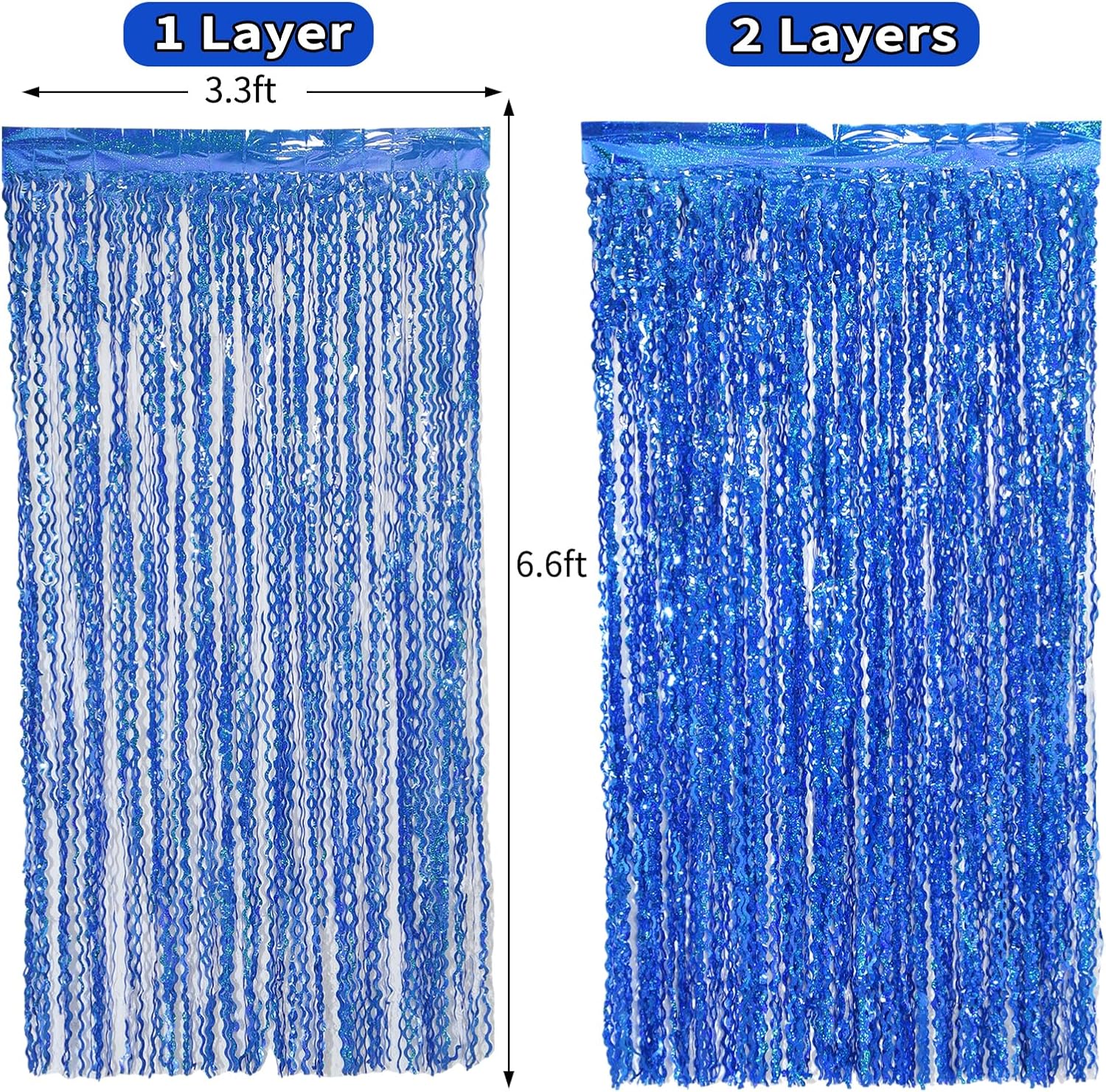 • Package Contents: 4 pack dark blue wavy foil fringe curtains,each curtain is 3.3ft x6.6ft,You can cut the metallic backdrop into the suitable length for use,Wonderful accessories for decorating doors and walls