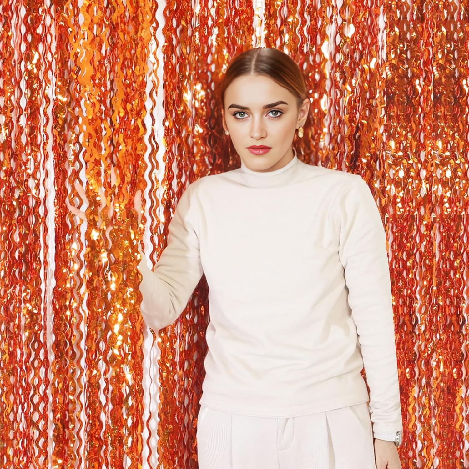• Package Contents: 4 pack orange wavy foil fringe curtains,each curtain is 3.3ft x6.6ft,You can cut the sparkle metallic backdrop into the suitable length for use,Wonderful accessories for decorating doors and walls