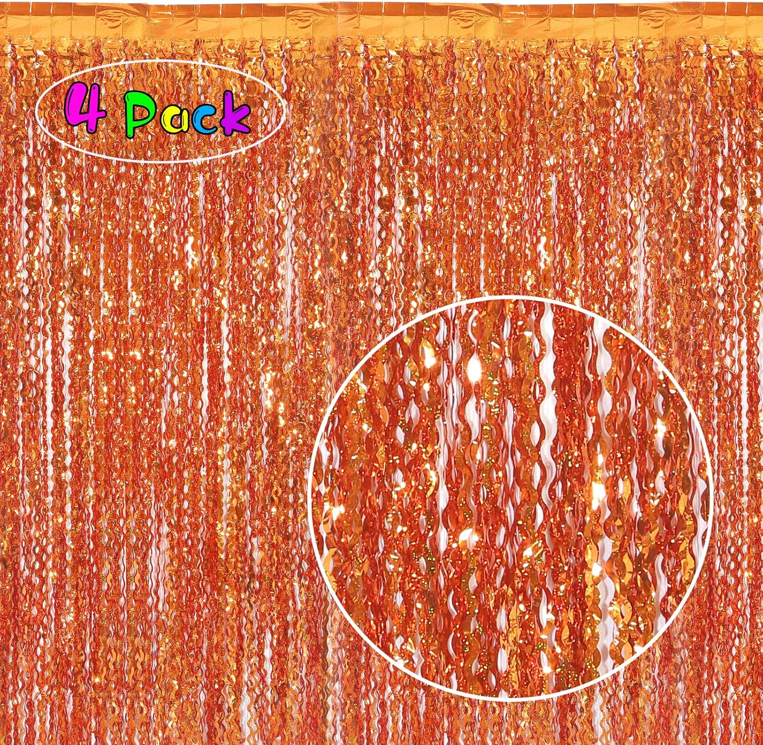 4 Pack Orange Wavy Metallic Tinsel Foil Fringe Curtains | 3.3 ft x 6.6 ft Party Streamer Backdrop Photo Booth for Orange Basketball Party Decorations Holloween Christmas