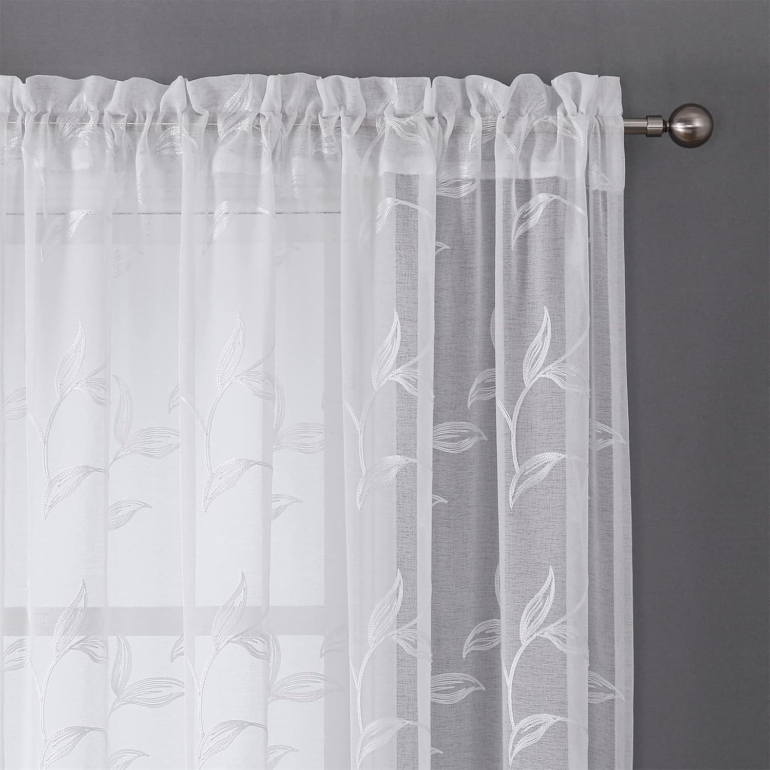 VISIONTEX Sheer Curtains 120 inch Length 2 Panels Set, White Voile Crushed Vine Leaves Embroidery, Rod Pocket Embroidered Window Drapes for Living Room and Bedroom, 54" x 120"