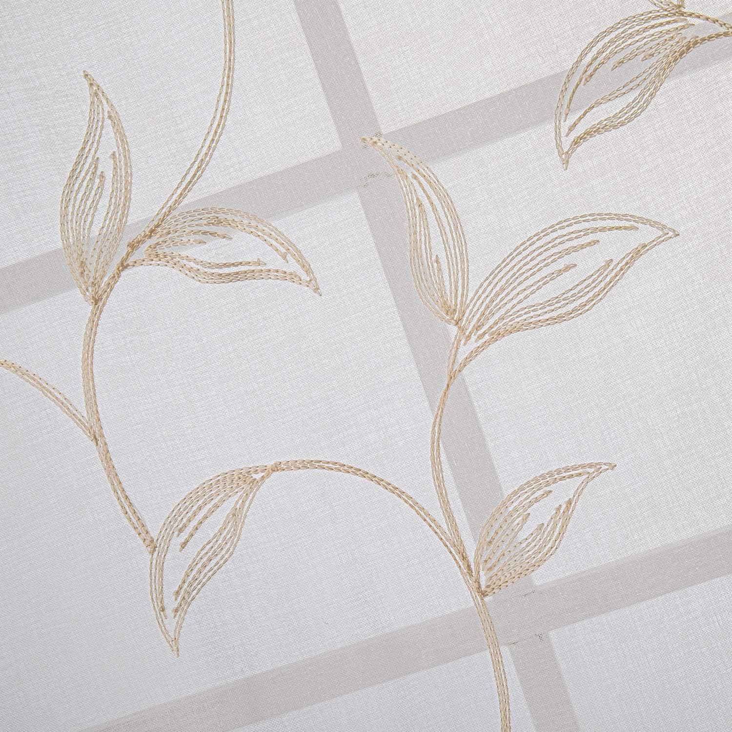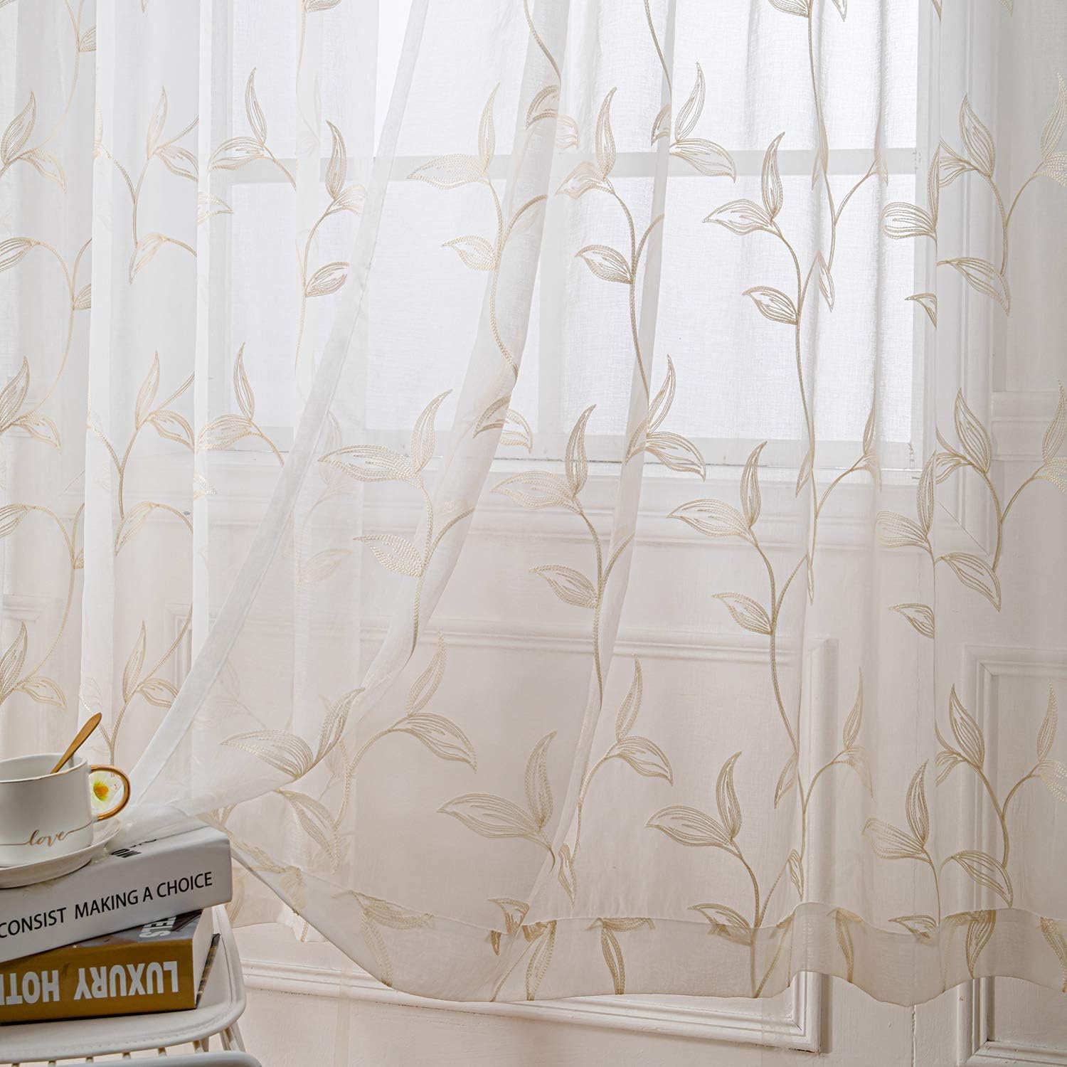 VISIONTEX Sheer Curtains 120 inch Length 2 Panels Set, White Voile Crushed Cream Vine Leaves Embroidery, Rod Pocket Embroidered Window Drapes for Living Room and Bedroom, 54" x 120"