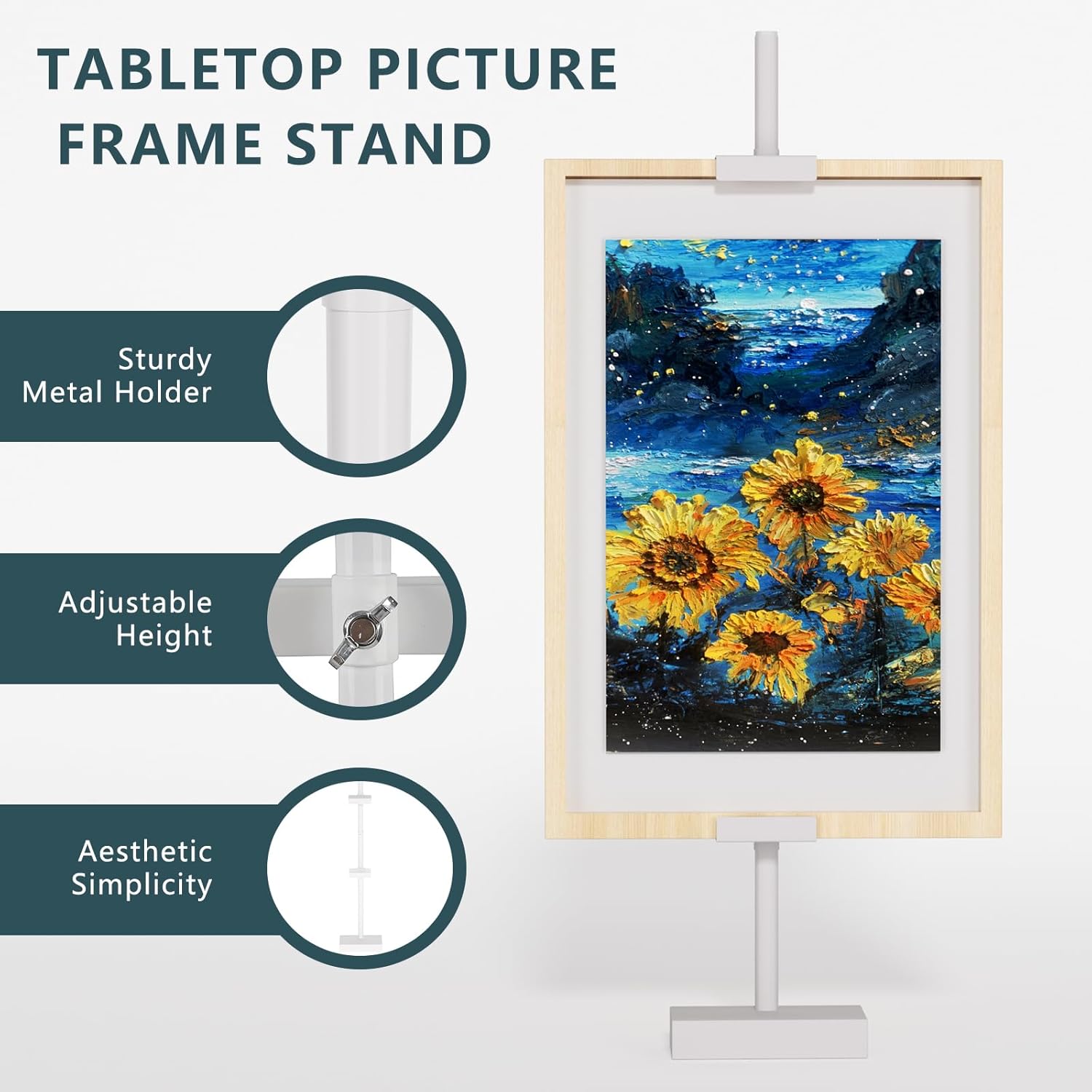 • ADJUSTABLE: Experience the ultimate flexibility in showcasing your artwork and memories with our adjustable art display stand for table. Freely adjustable height to fit your frame(up to 29.7"H, 1.5"D). Note: Please do not overtighten while adjusting to avoid damaging the coating.