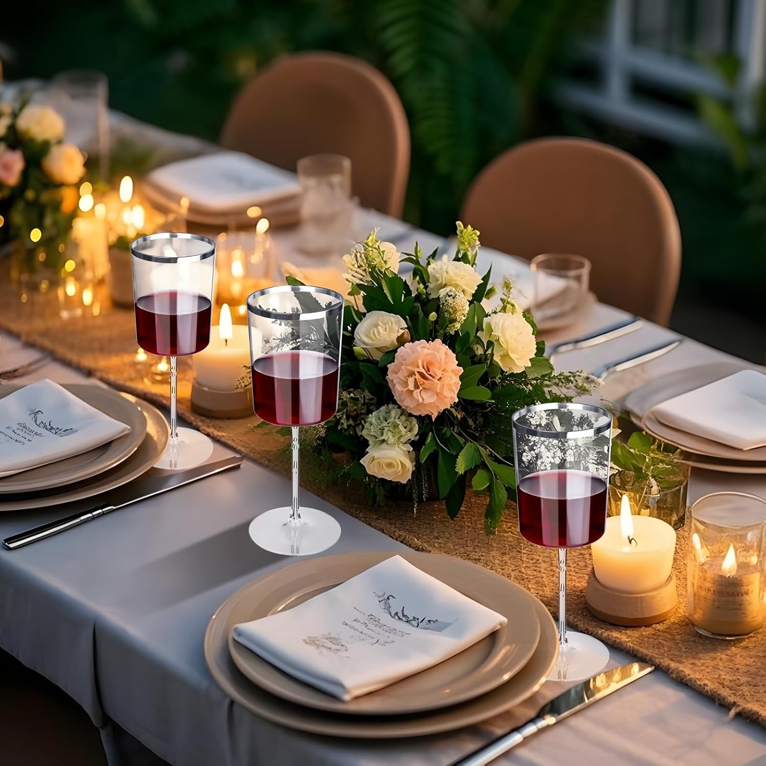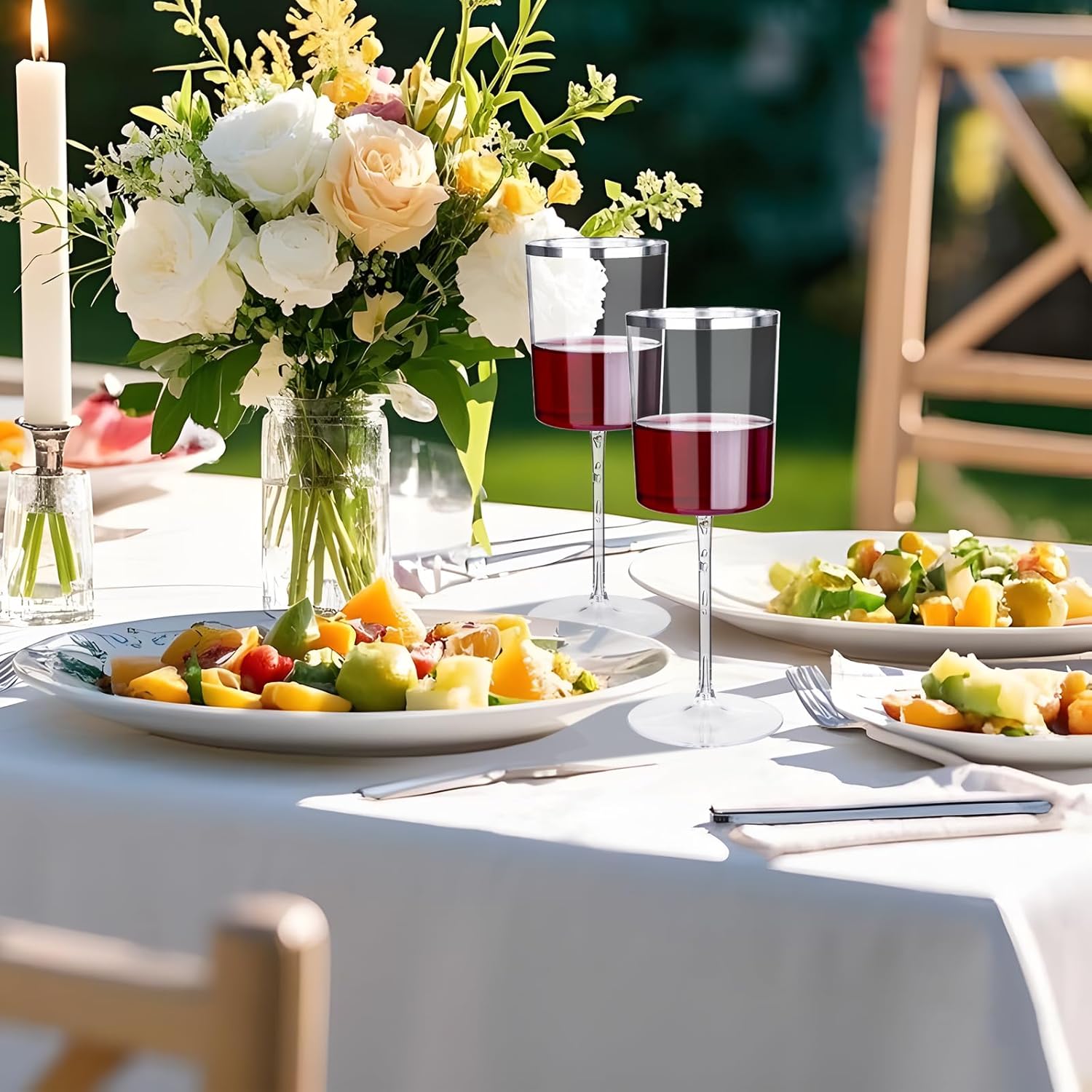• Sleek and Stylish Design: This plastic wine glasses with stem exudes elegance and sophistication with its silver rim. Disposable wine glasses perfect for both casual and formal occasions. This plastic wine glasses disposable's sleek design ensures that you'll make a stylish statement.