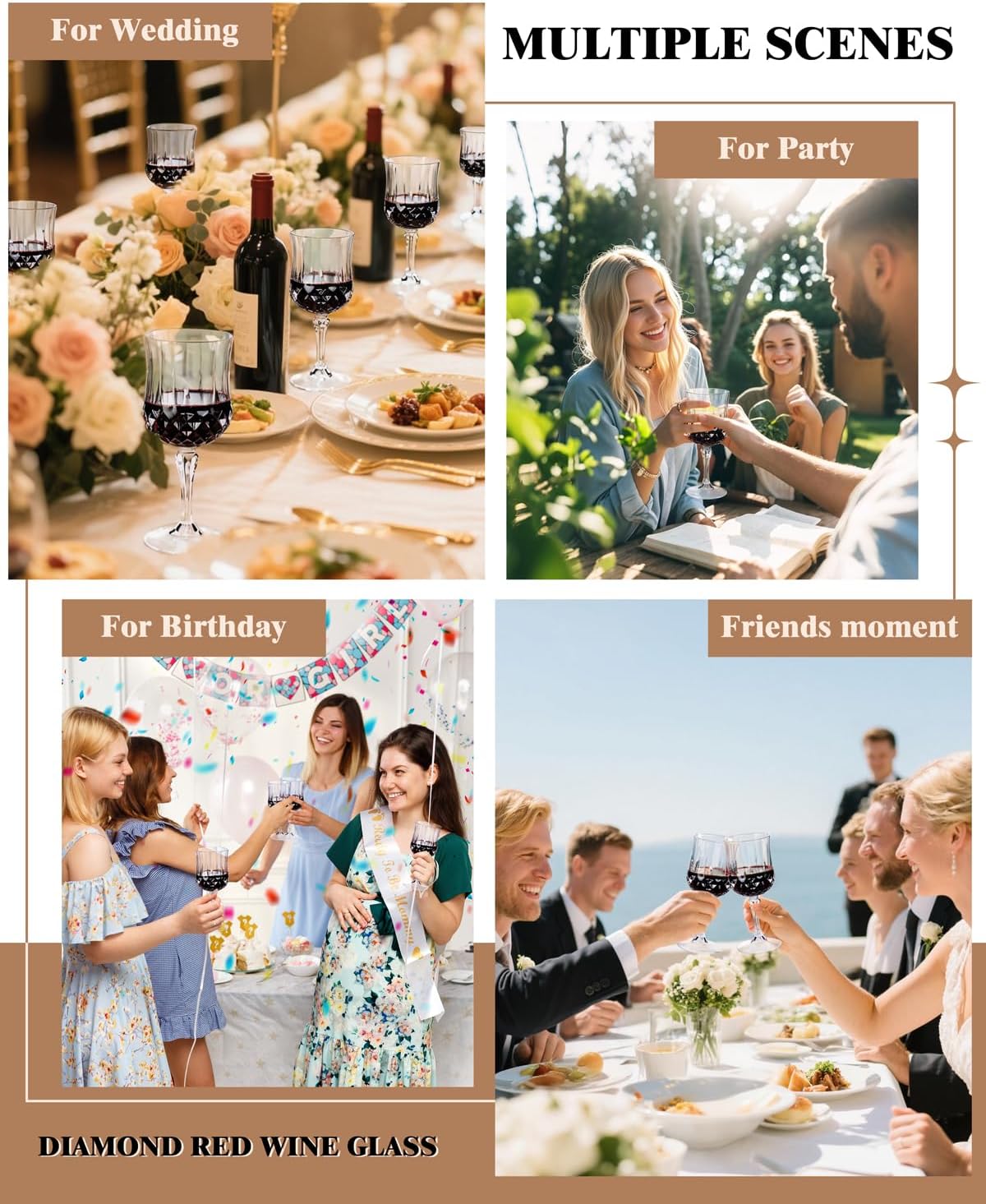• Retro diamond-shaped pattern design: Imitating real crystal, plastic wine glasses have the charm of a vintage wine glass. Plastic wine glasses disposable’s retro design enriches the modern and classic dining table setting with an elegant atmosphere.