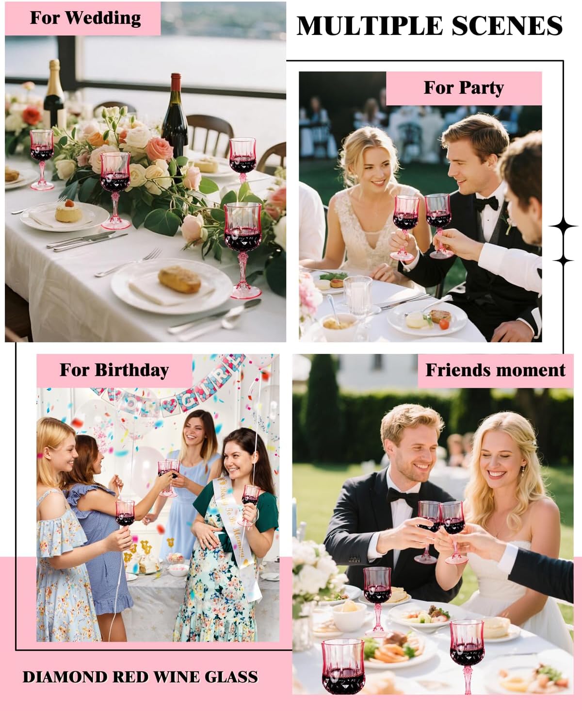 • Retro diamond-shaped pattern design: Imitating real crystal, plastic wine glasses have the charm of a vintage wine glass. Plastic wine glasses disposable’s retro design enriches the modern and classic dining table setting with an elegant atmosphere.