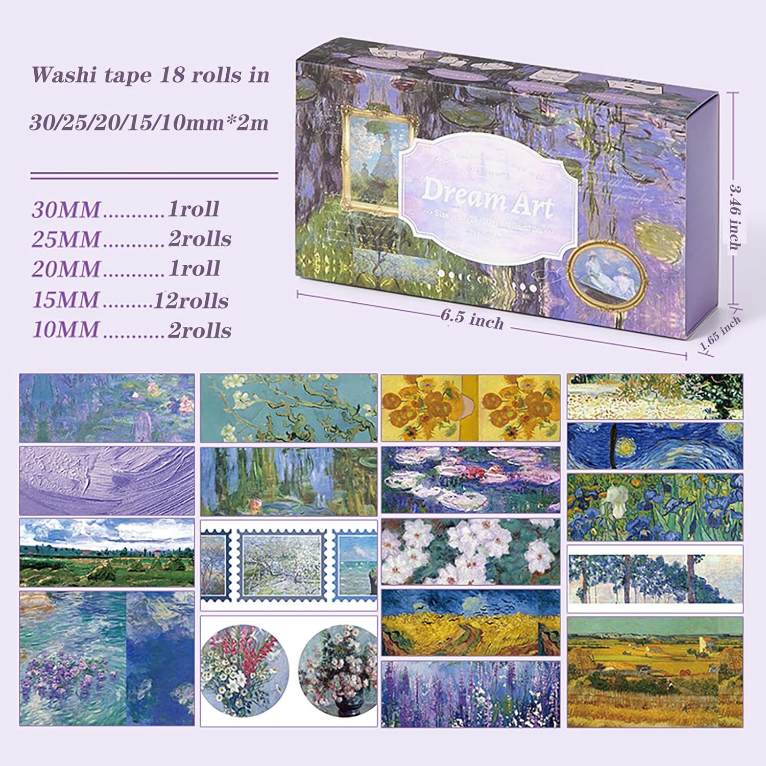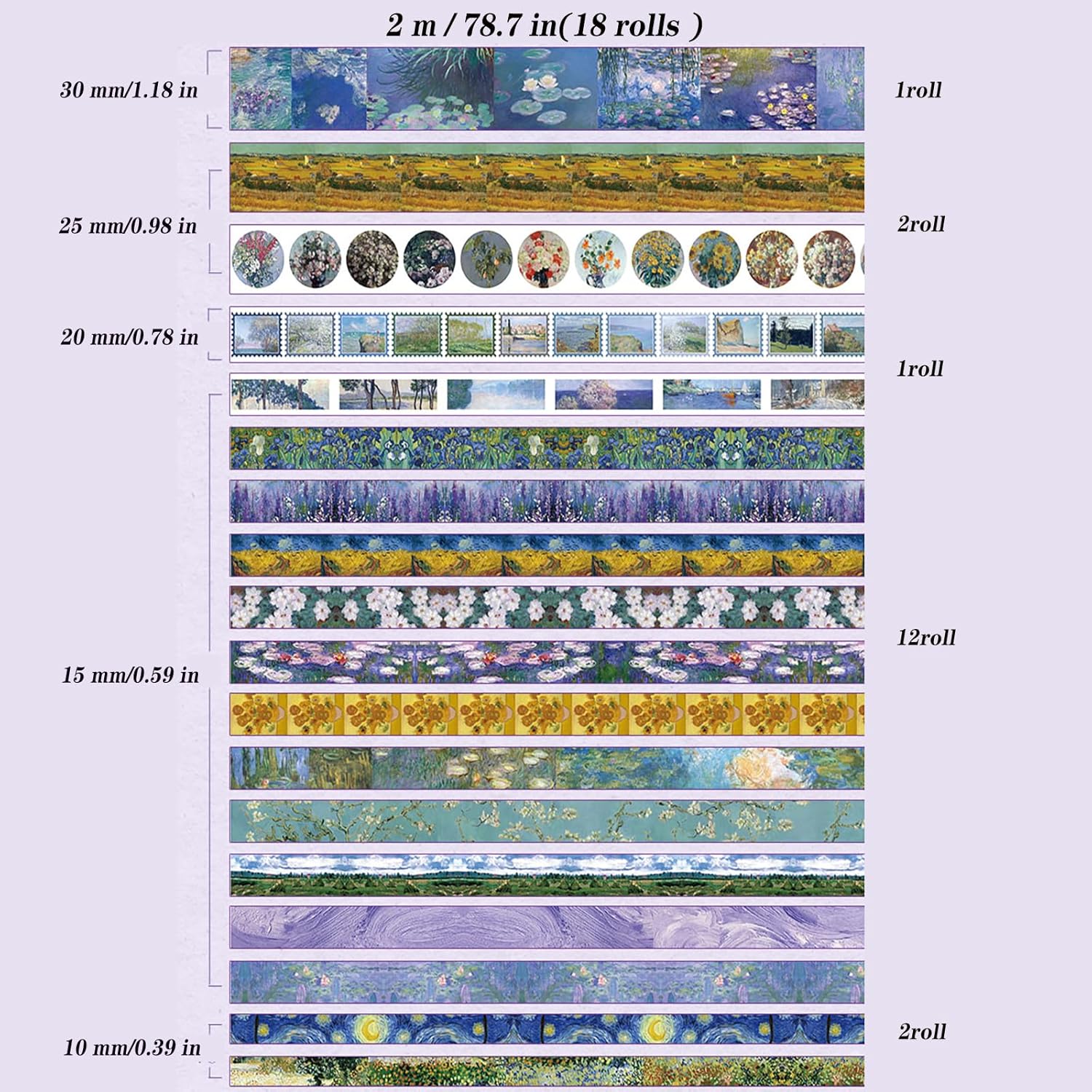 • Van Gogh's Art washi tape comes in a box with 18 rolls of high-quality washi tape in five sizes, including wide and thin washi tape. Each roll is 1.18 inches (30 mm) x 1 tape; 0.98 inches (25 mm) x 2 tapes; 0.78 inches (20 mm) x 1 tape; 0.59 inches (15 mm) x 12 tapes; 0.39 inches (10 mm) x 2 tape.