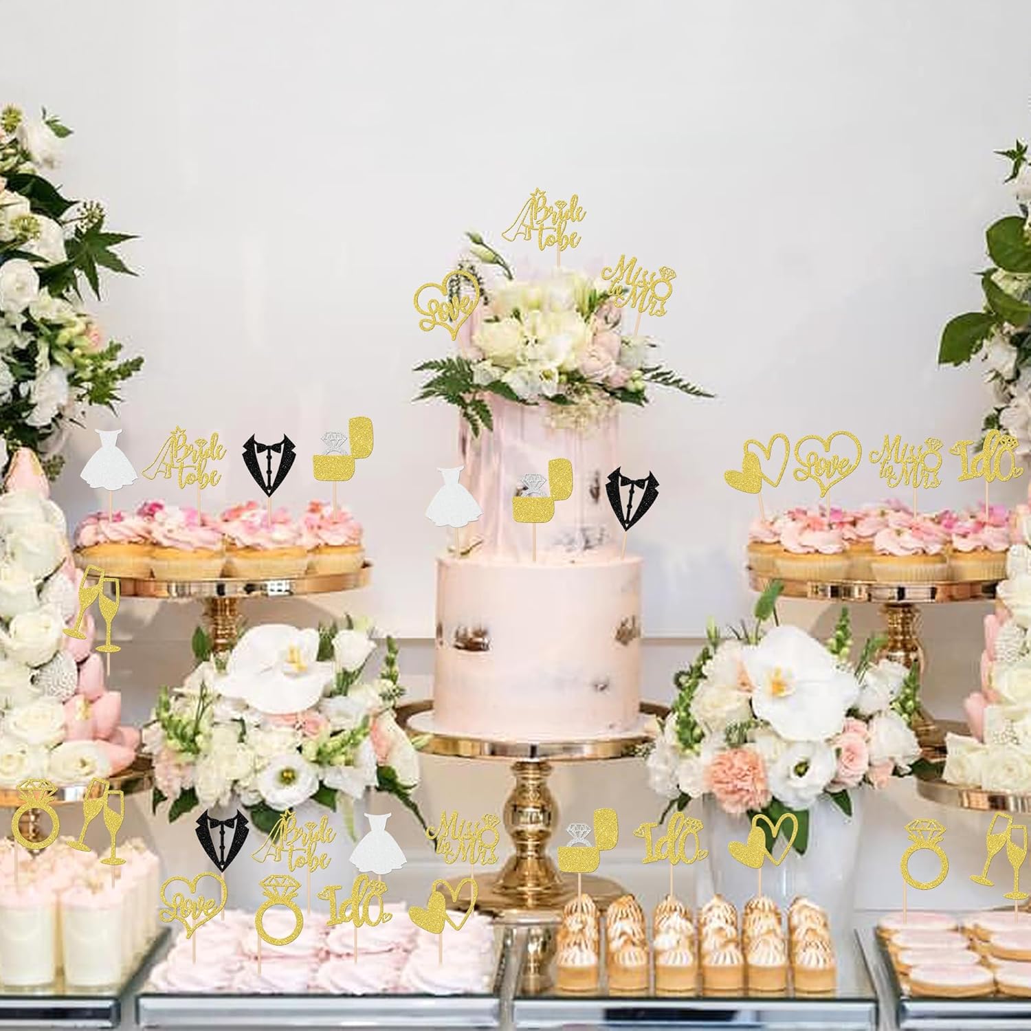 30 PCS Bride to Be Cupcake Toppers Glitter Wedding Cupcake Toppers I Do Love Heart Ring Miss to Mrs Cupcake Picks for Bridal Shower Wedding Engagement Party Cake Decorations Supplies Gold