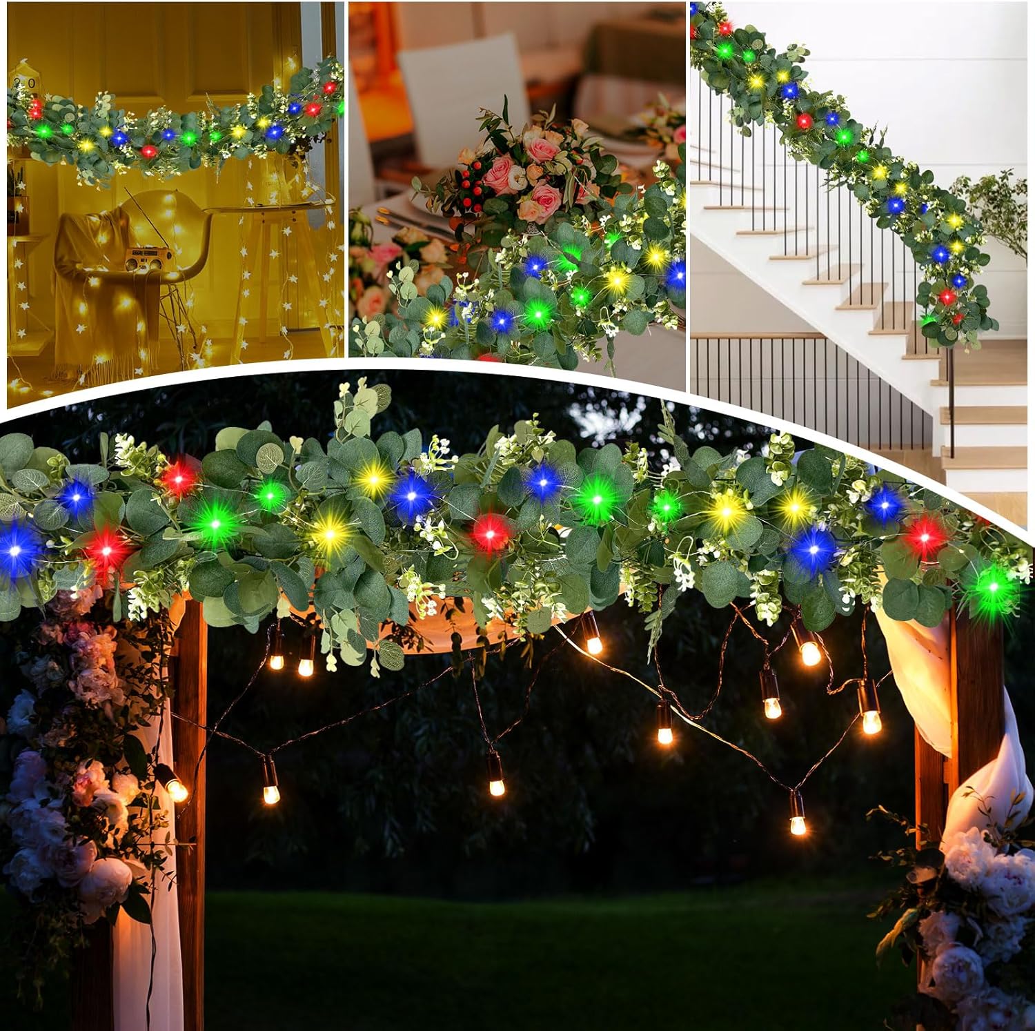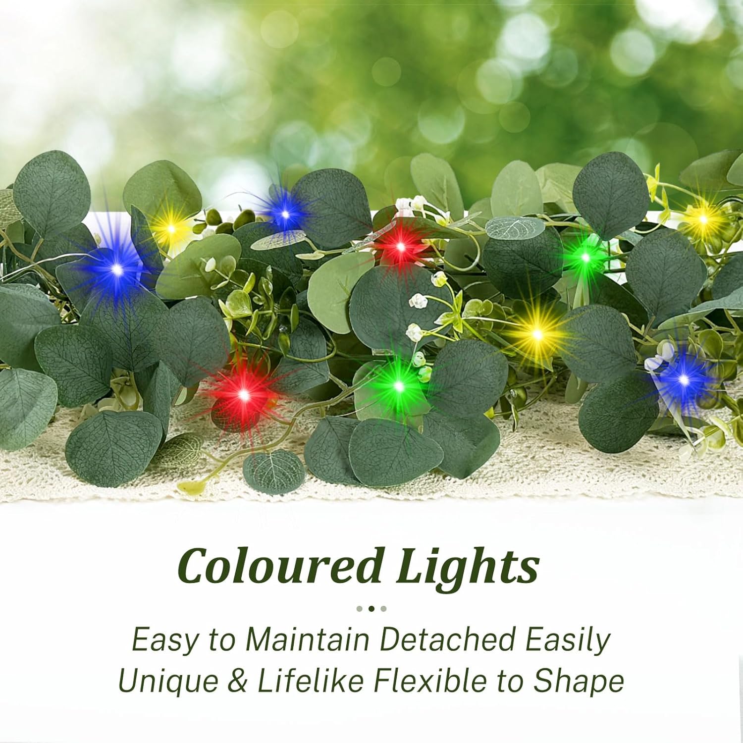 • 【Eucalyptus Garland with Lights】This package with 2 pieces of eucalyptus vines.Each artificial greenery garland is equipped with 20 LED Colored lights, providing a gentle glow to enhance your home's ambiance. These lights are powered by 2 AA batteries (not included)