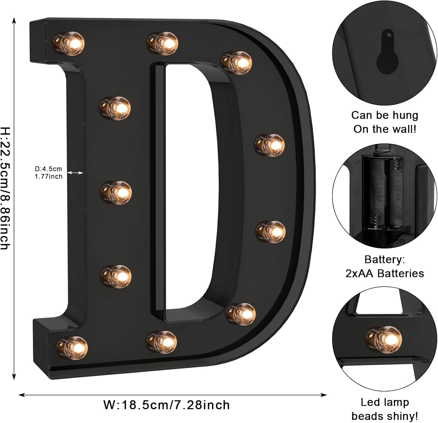 Foaky Black LED Letter Lights for Room Decor - Bedroom Wall Decor, Alphabet Lights for Home, Wedding, Party - Battery Operated (D)