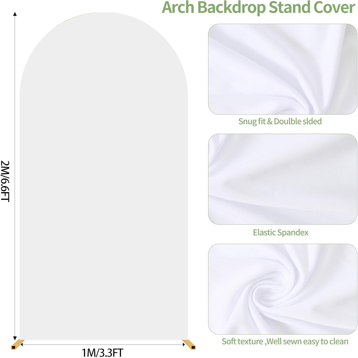 • What you get:1 Pc White wedding arch cover(Only Cover). Material: Spandex. Size: 6.6x3.3ft/2Mx1M(HxW). Color: White.