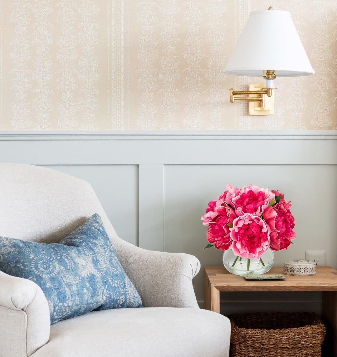 • 💐【Realistic & Elegant】Peonies artificial flowers with glass vase suits look so beautiful, unique craft design, brings different visual enjoyment to your home, create a romantic atmosphere, make you happy every day. Faux water on the vase adds to the pulchritude and realism. More realistic because of the details!