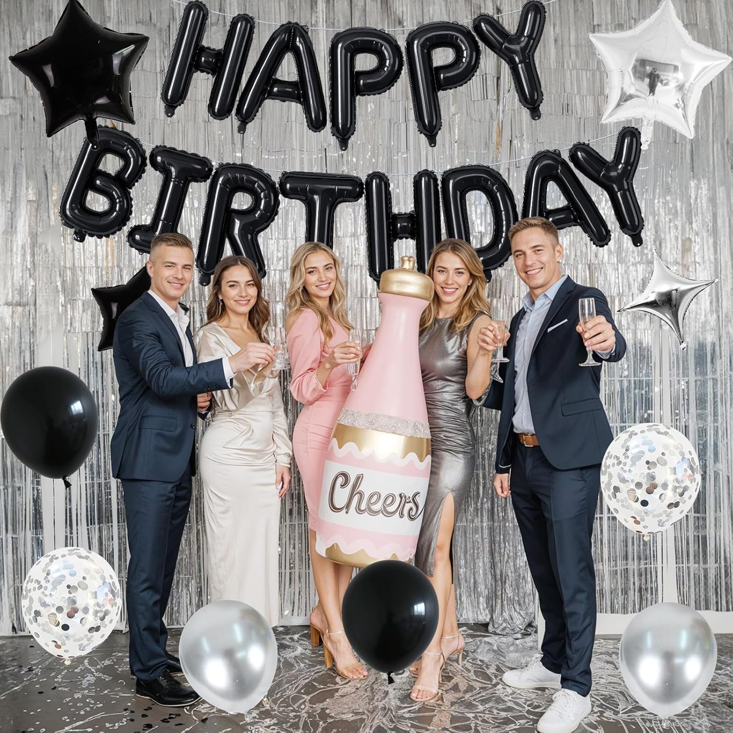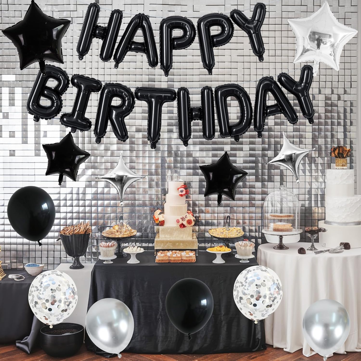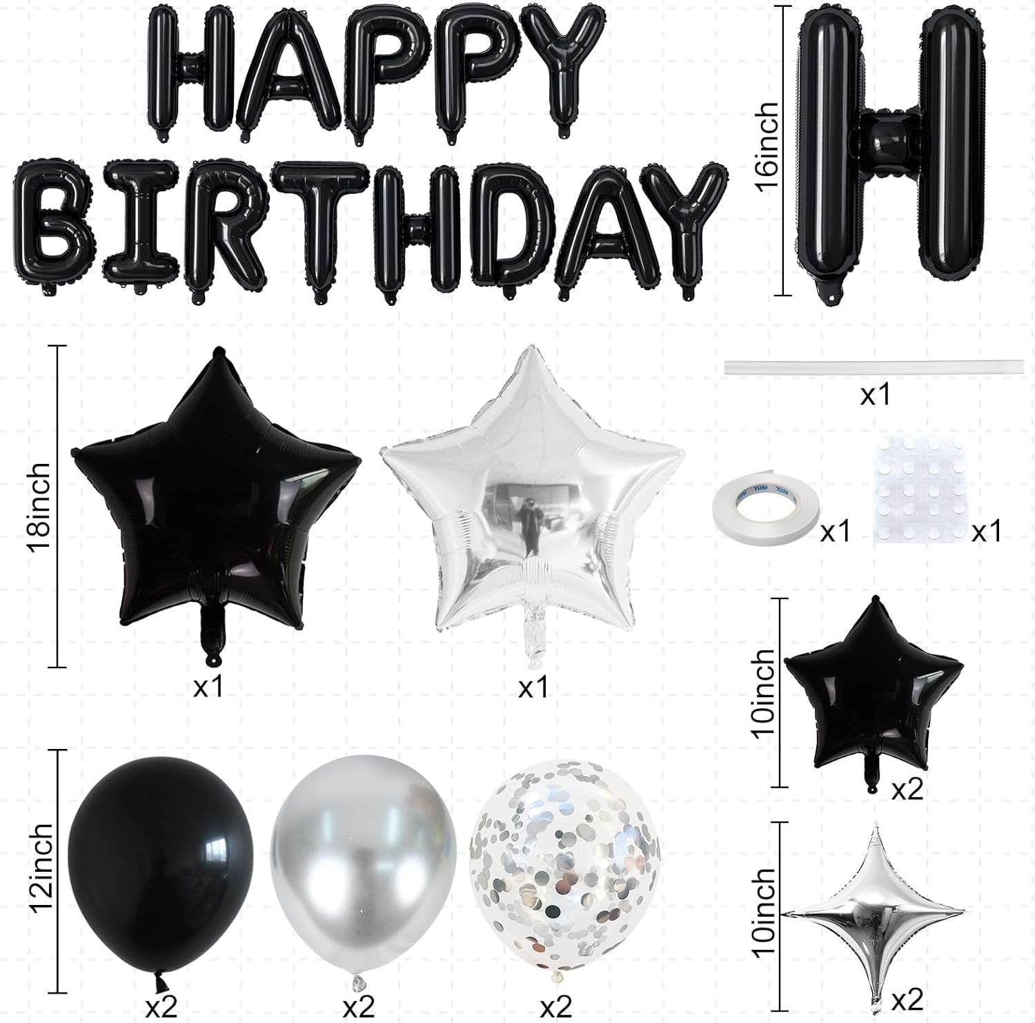 • VALUABLE PARTY DECORATION SET – Create an unforgettable birthday celebration with our Happy Birthday Balloons Banner set! Includes a 16-inch black Mylar Foil Letter Balloons set, 10 black & silver star balloons, metallic silver and confetti balloons, plus essential accessories like a ribbon, glue dots, and a straw for easy setup. Everything you need for a stylish and hassle-free party!