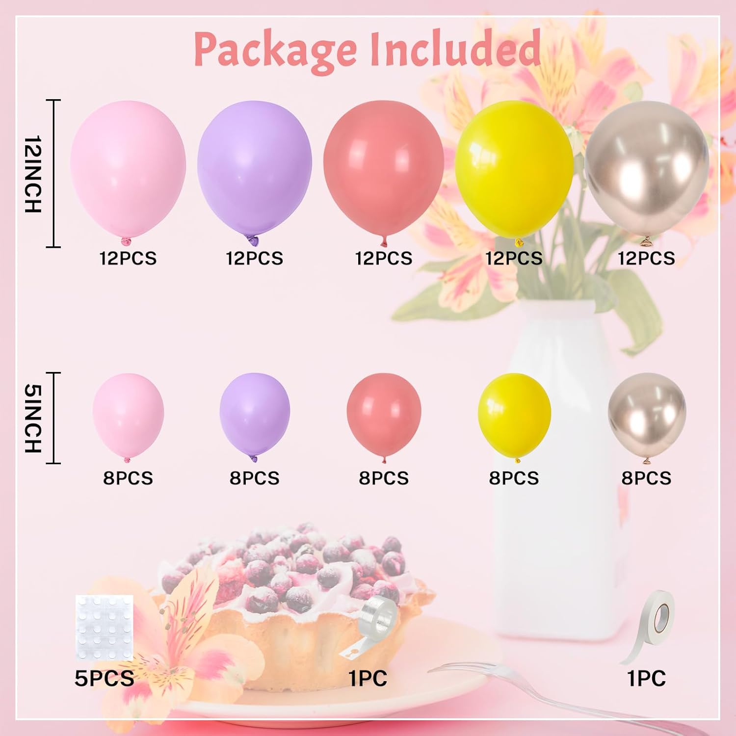 • What You Get - Fairy Pastel Pink Purple Yellow Balloon Garland Arch Kit, package including 60pcs 12 inches balloons(macaron pink*12, macaron purple*12, dusty pink*12, yellow*12, metallic champagne gold*12), 40pcs 5 inches balloons(macaron pink*8, macaron purple*8, dusty pink*8, yellow*8, metallic champagne gold*8), 1 roll of 5 meters balloon strips, 1 roll of ribbon, 5pcs dot glues. Total 107 pcs, all in one package!