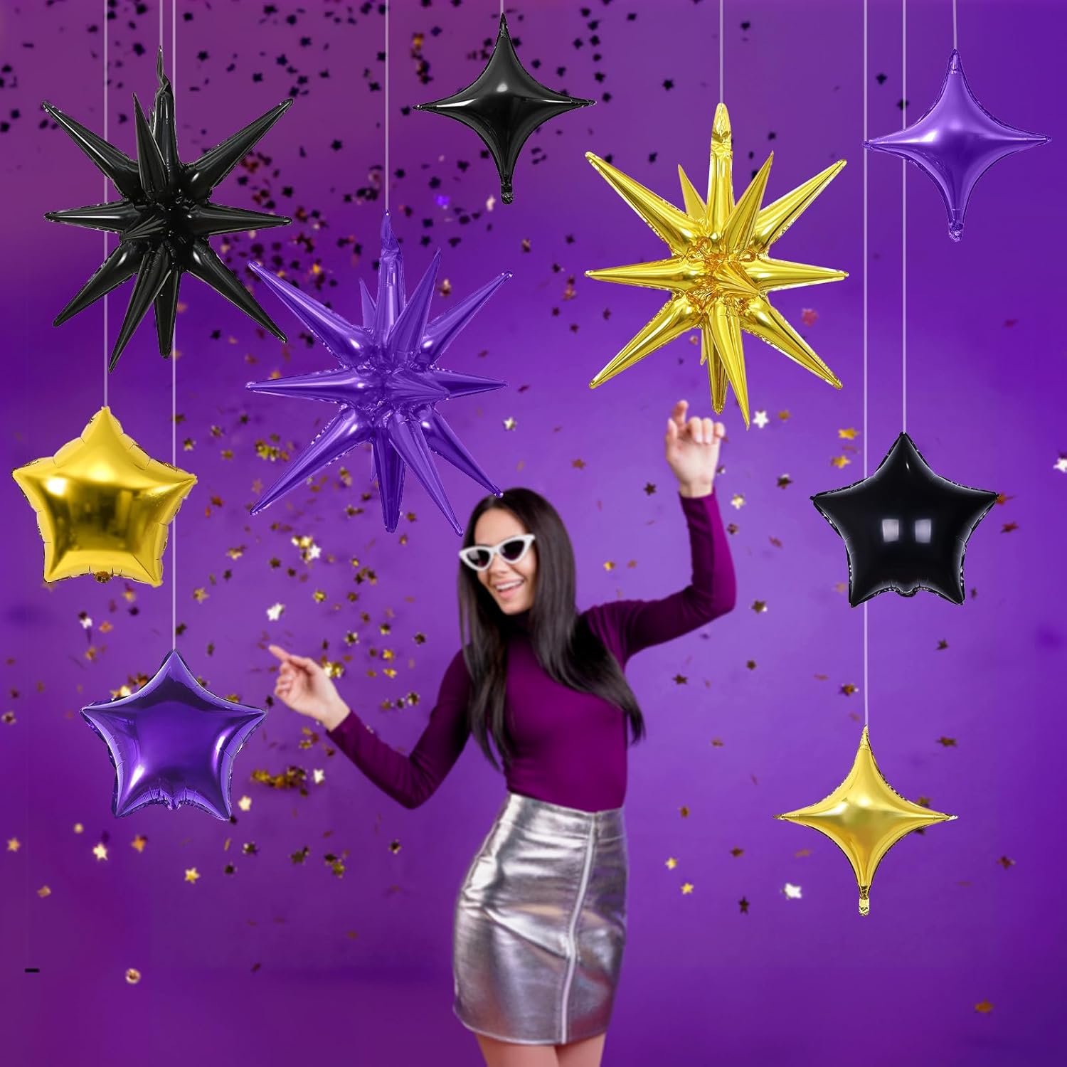 • Purple Gold Balloons Set: Package includes: purple, black, gold three-color aluminum foil star balloons (explosion stars × 3, four-pointed stars × 6, five-pointed stars × 6) , a straw and ribbon