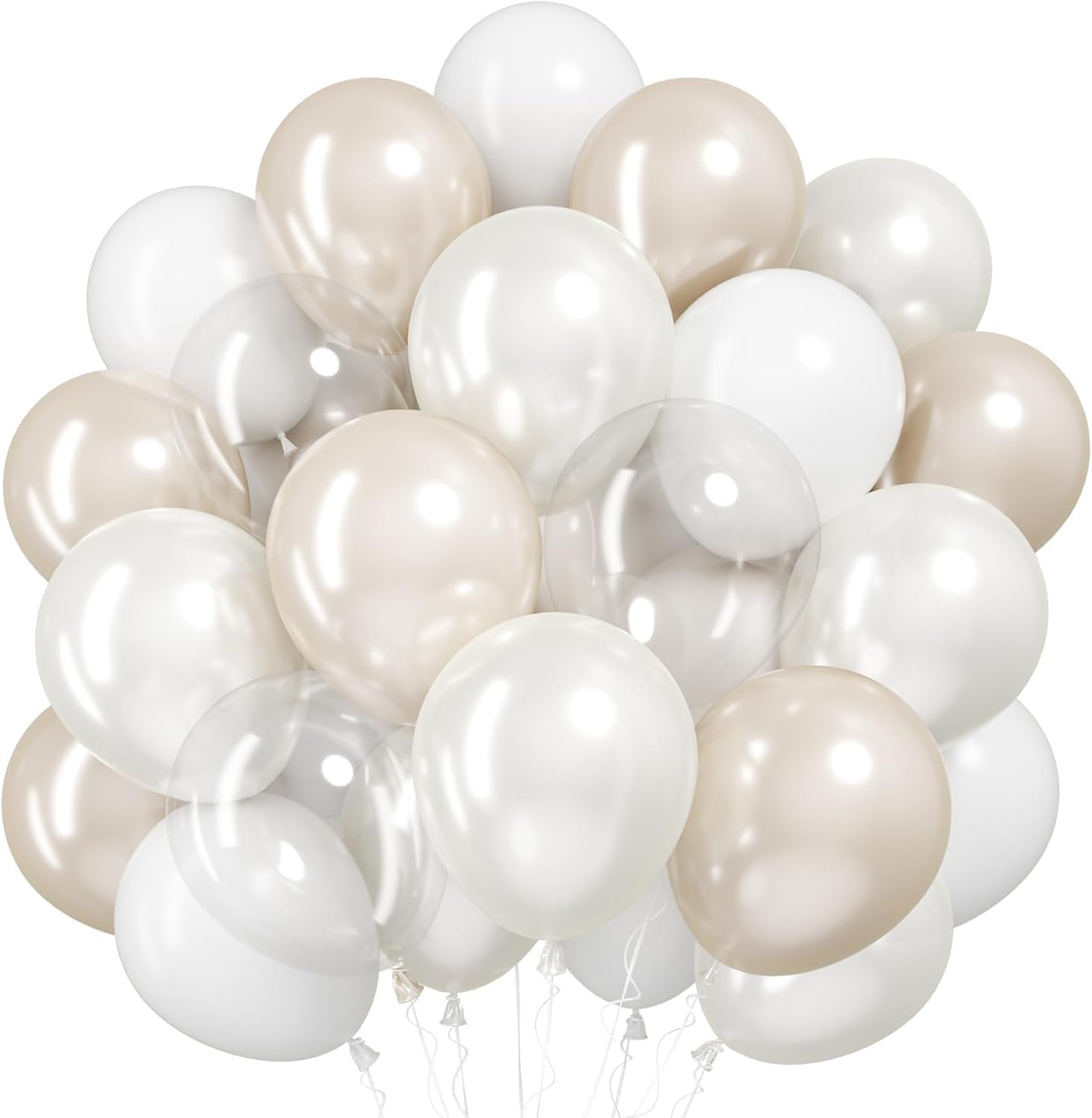 • 12 Inch Pearl White Balloon Set: 15 x pearl sand white balloons, 12 x matte clear balloons, 15 x white balloons, 8 x double balloons, and 1 x white ribbon. This stunning combination of soft white and cream balloon is ideal for creating an elegant atmosphere for weddings, baby showers, and other special celebrations.