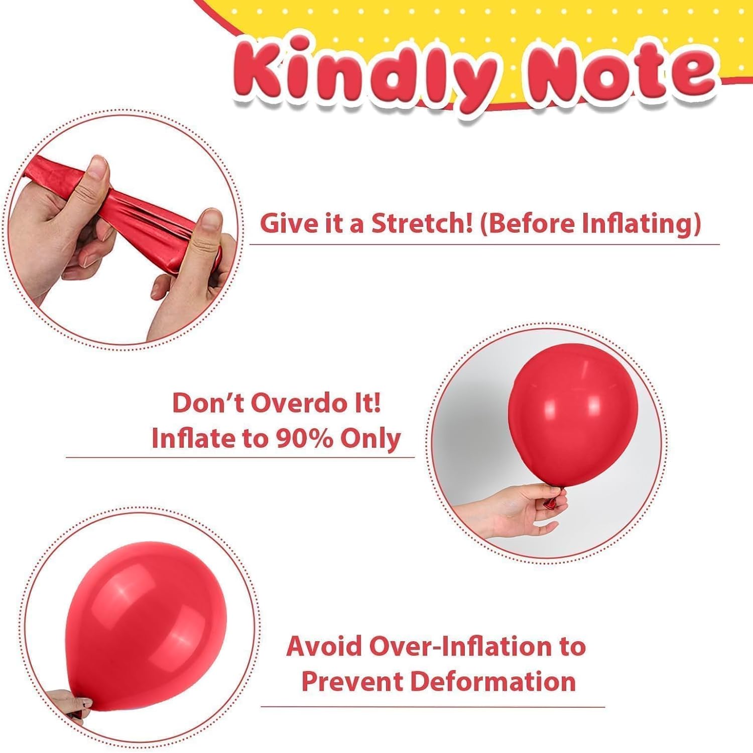 • Party-Ready Tips: Please be careful not to overfill the balloon to avoid bursting,away from sharp objects and direct sunlight to prevent damage. Please note that it is normal for 2-3 balloons out of the all to have some damage or small holes. If you have any questions or need assistance, please don't hesitate let us know.We will help you within 24 hours.