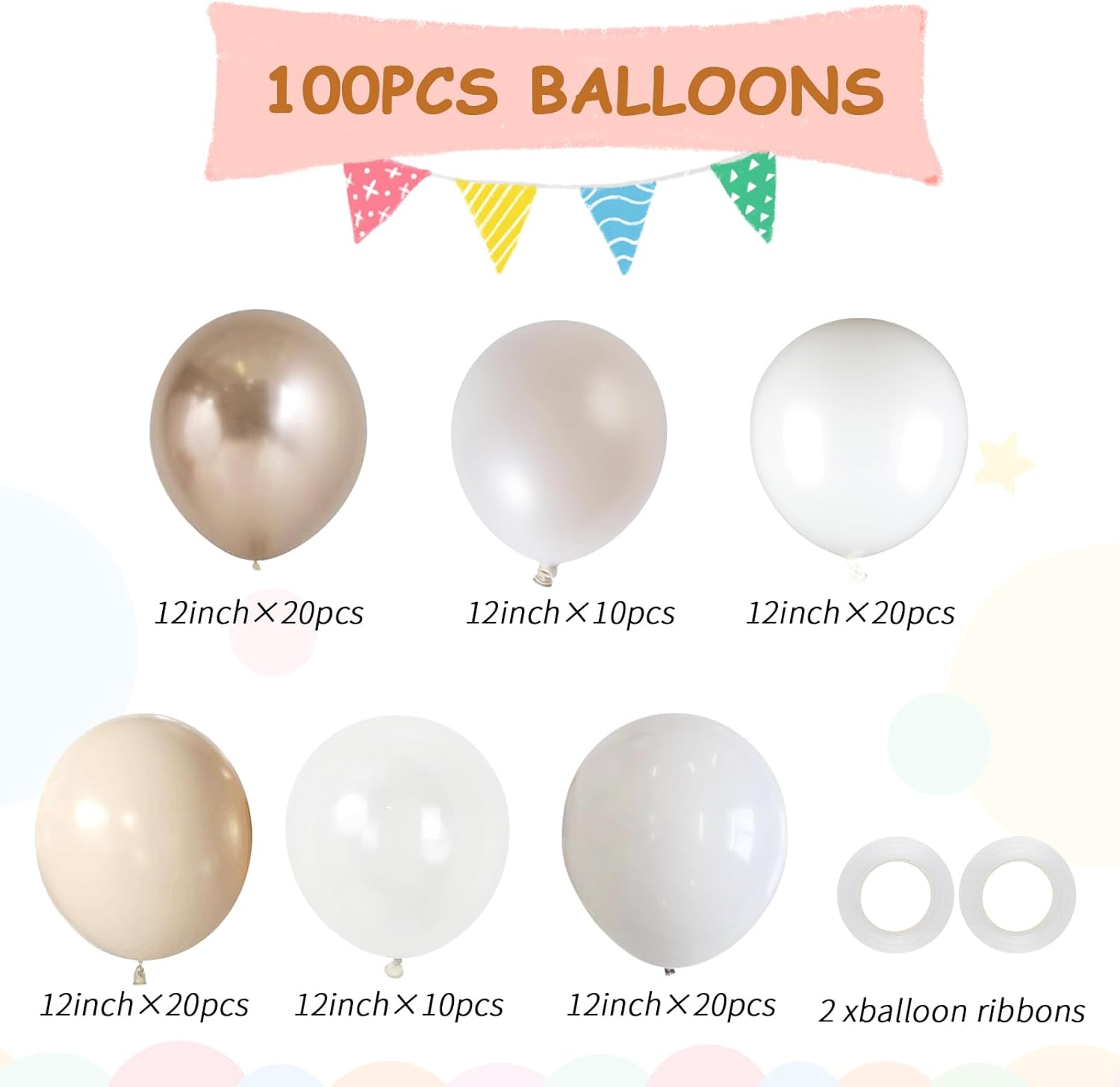 • Elegant Neutral Balloons : Come with 100pcs party balloons, Includes 20 metallic champagne gold balloons, 20 sand white balloon, 20 white balloons, 20 nude balloons, 10 pearl white balloons, 10 clear balloons, 2 balloon ribbons. All the balloon size is 12 inches after inflation.