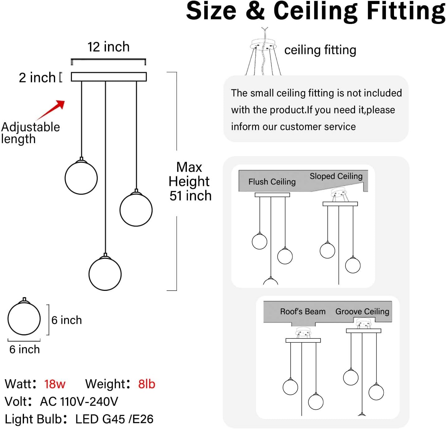 • 【Glass Ball Chandelier Size】Black Chandelier ceiling plate diameter: 12 inch, Chandelier max height: 51inch.Crystal size:W 6inch * H 6inch,The chandelier weighs about 8LB
