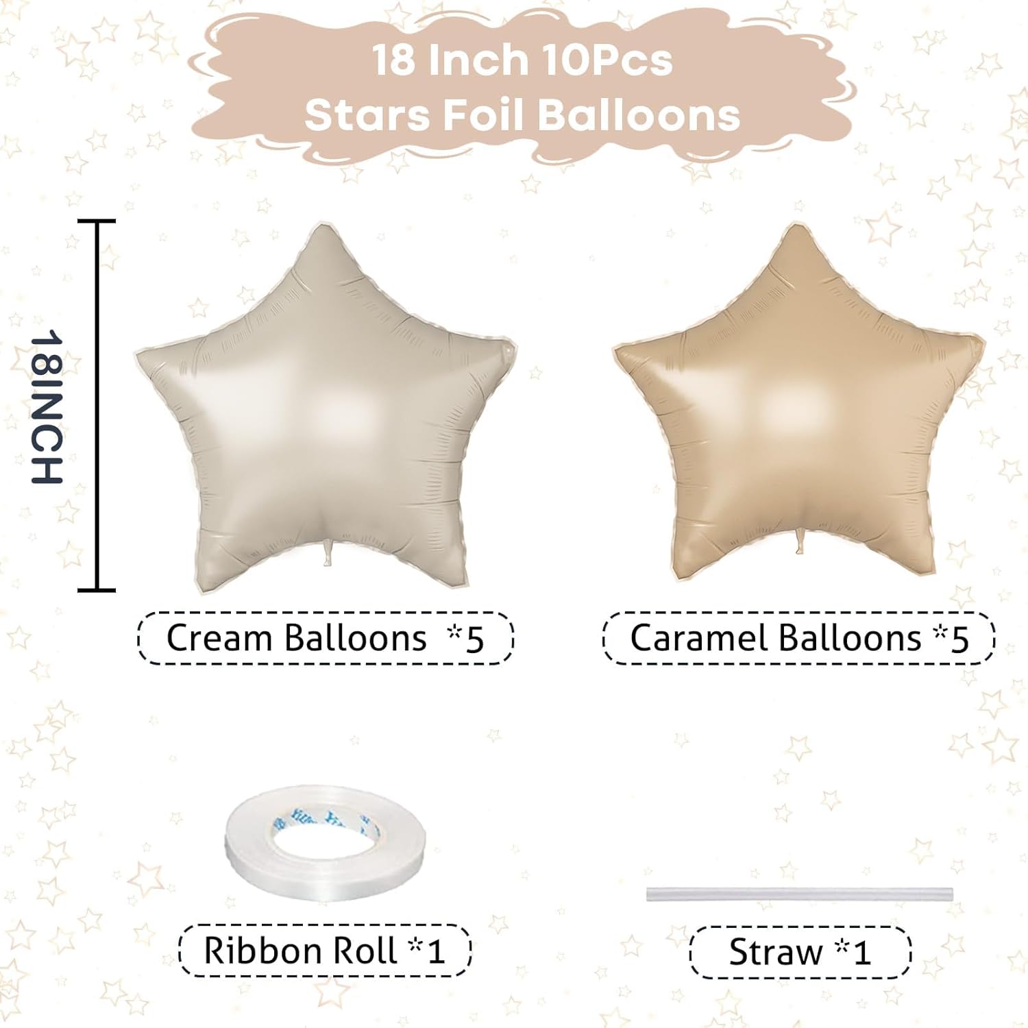 • Beige Apricot Stars Party Balloons: This 10Pcs nude caramel foil star balloons set designed with Giant 18 inch pentagram foil balloons, includes cream star mylar balloons and caramel star mylar balloons, each balloons set comes with a straw and ribbon