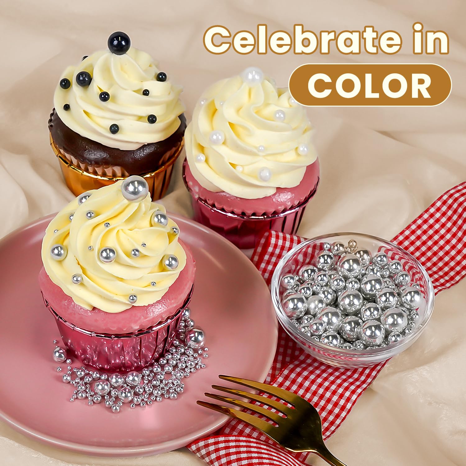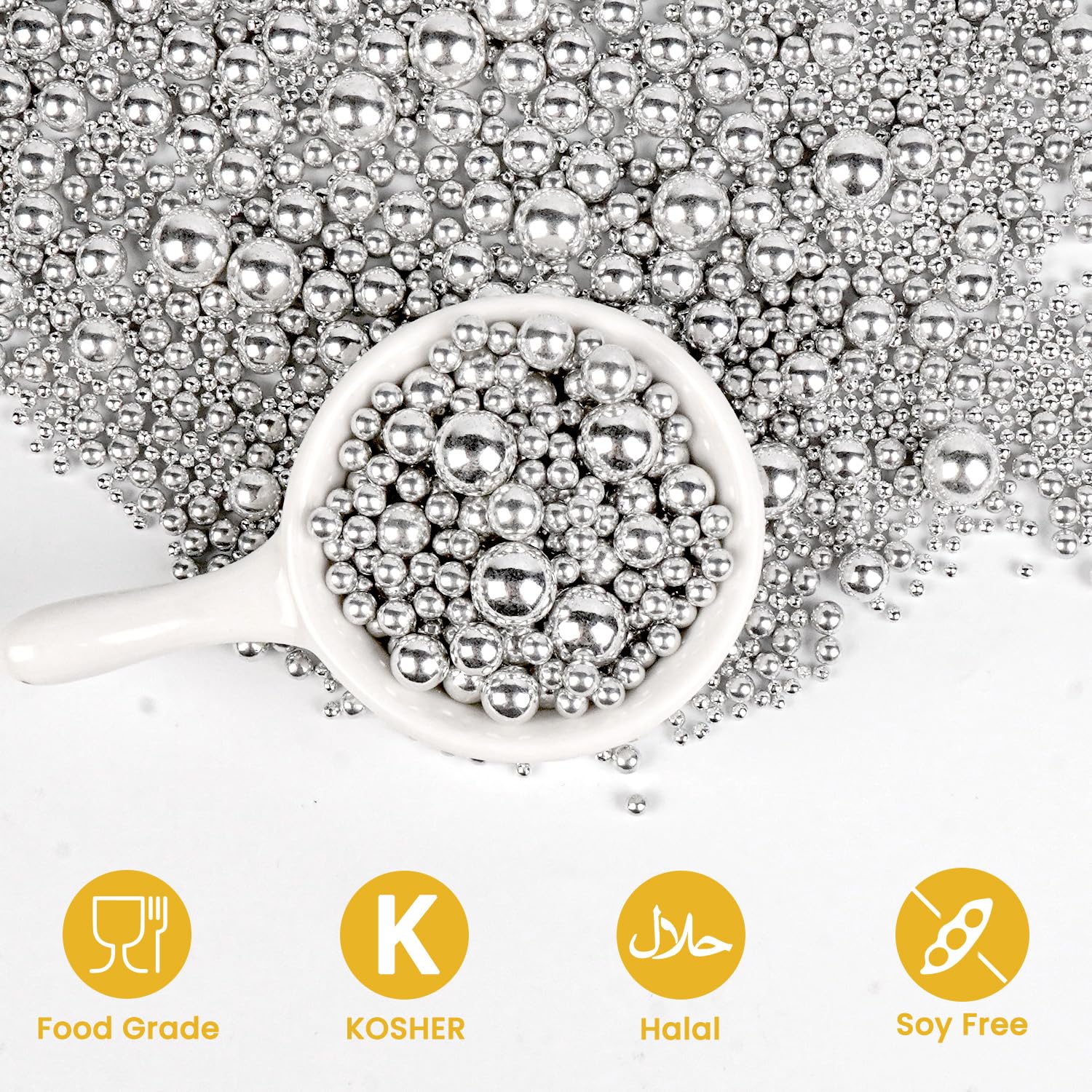 • Safe & Certified Pearls: Food-grade silver pearls sugar sprinkles made with non-GMO ingredients, 0% preservatives. Kosher/Halal-certified in facilities with no allergens (soy/nut/dairy). Tamper-proof sealed for safety.