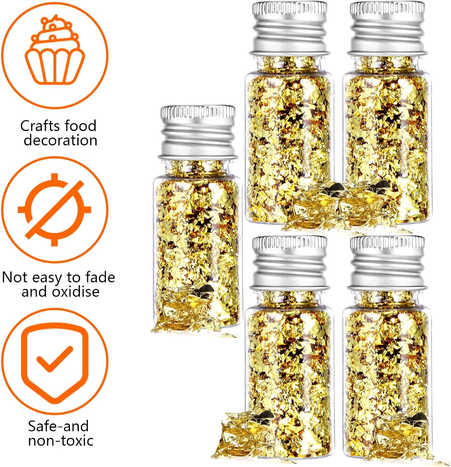 • EDIBLE GOLD FLAKES: Gold leaf for baking can create a stunnings sparkling effect, can make your crafts look unique and compatible with various foods. Imitation gold flakes also perfect for interior design, arts and crafts or metal gilding work, sculpture etc.