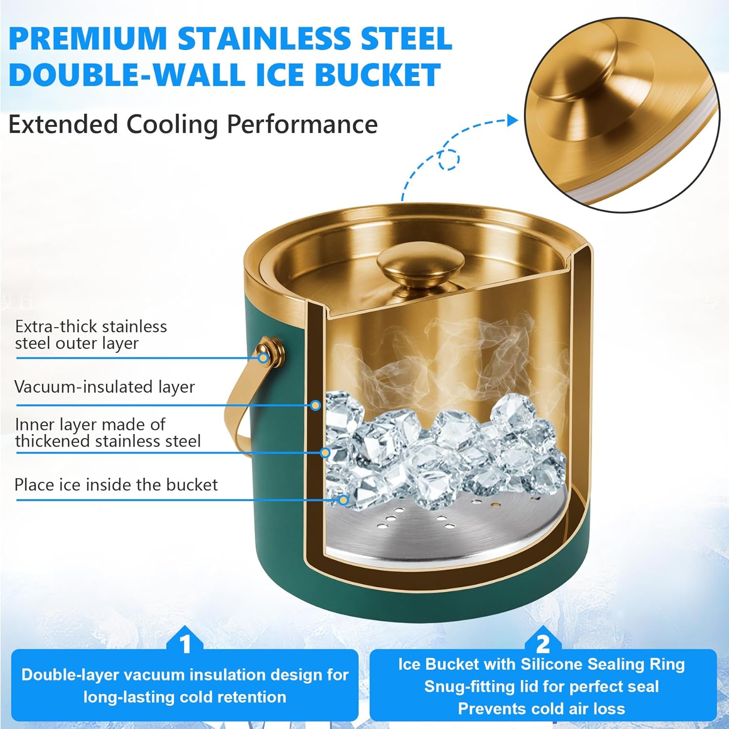 Ice Bucket, Ice Bucket with Silicone Sealing Ring Double-Wall Vacuum Insulation Champagne Buckets with Filter Layer Ice Tongs Ice Scoop (Green, 3 L)