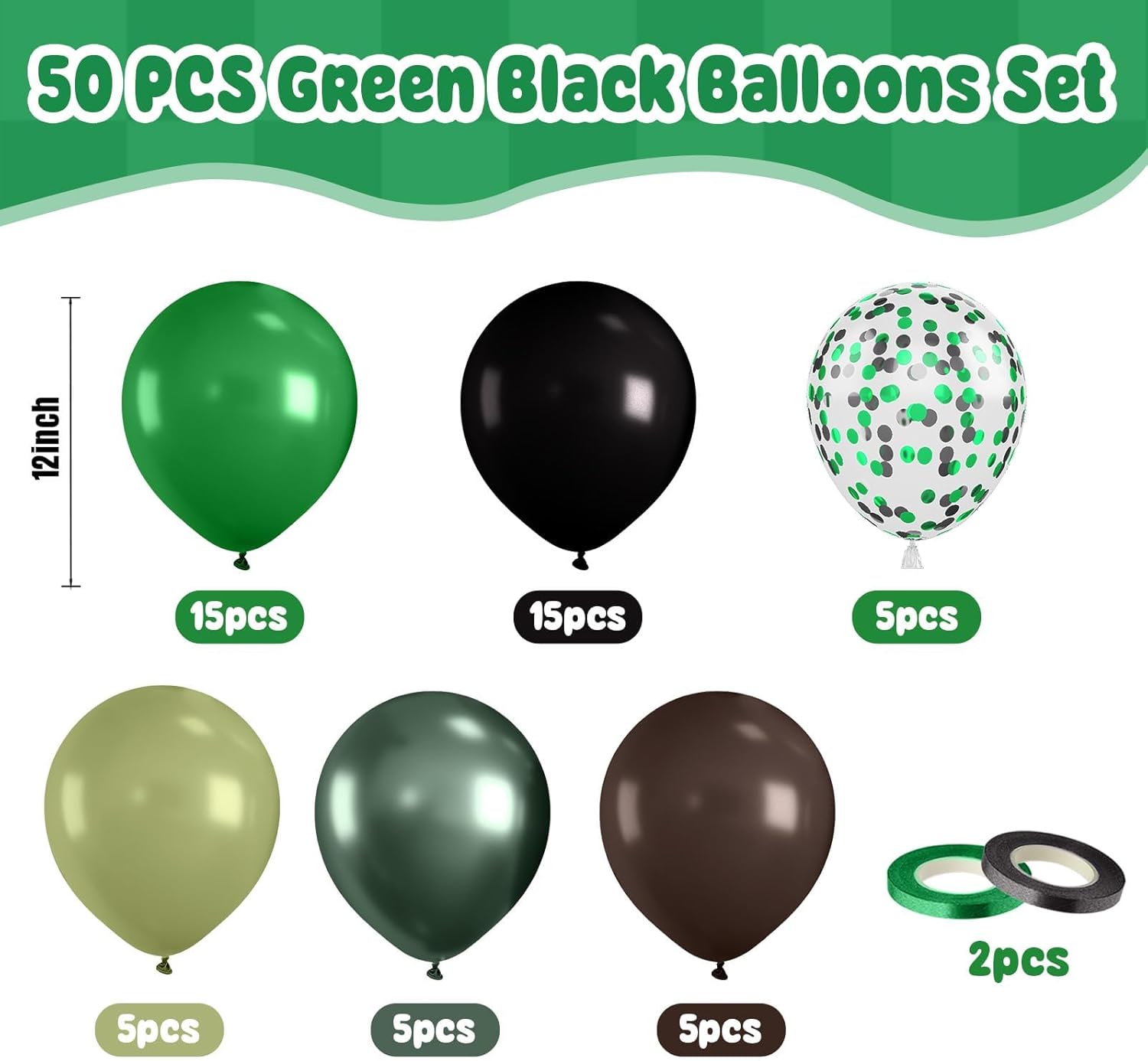 • 【WHAT YOU WILL GET】Our Camo Camping Theme Birthday Party Balloons include 50pcs latex balloons, designed to help you create stunning decoration: 15 x dark green balloons, 15 x black balloons, 15 x brown balloons, 5 x metallic avocado green balloons, 5 x retro avocado green balloons, 5 x confetti black green balloons, 1 x green ribbon and 1 x black ribbon. The size of the balloon is about 12 inches after inflation.coration.