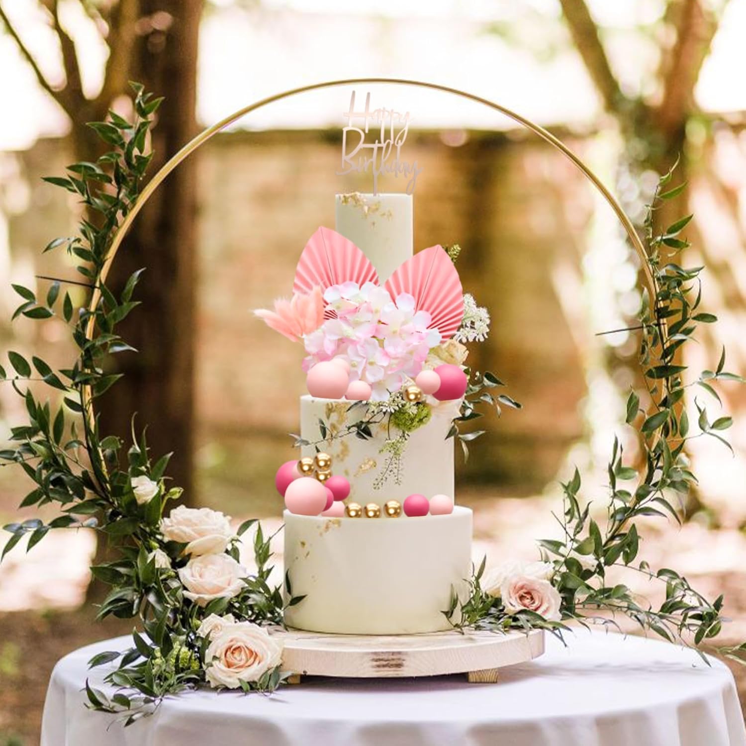 Gyufise 29Pcs Rose Red Artificial Flower Cake Decorations Acrylic Happy Birthday Cake Topper Balloon Cake Toppers Palm Fan Cake Picks for DIY Wedding Birthday Valentine's Day Party Supplies