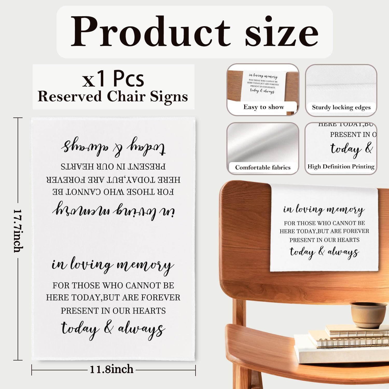 • Universal Fit: Each reserved seat sign measures approx. 30 x 45 cm / 11.81 x 17.72 inches, making it suitable for most standard chairs and benches. The size ensures that the message is easily visible to guests, while remaining easy to store and carry.