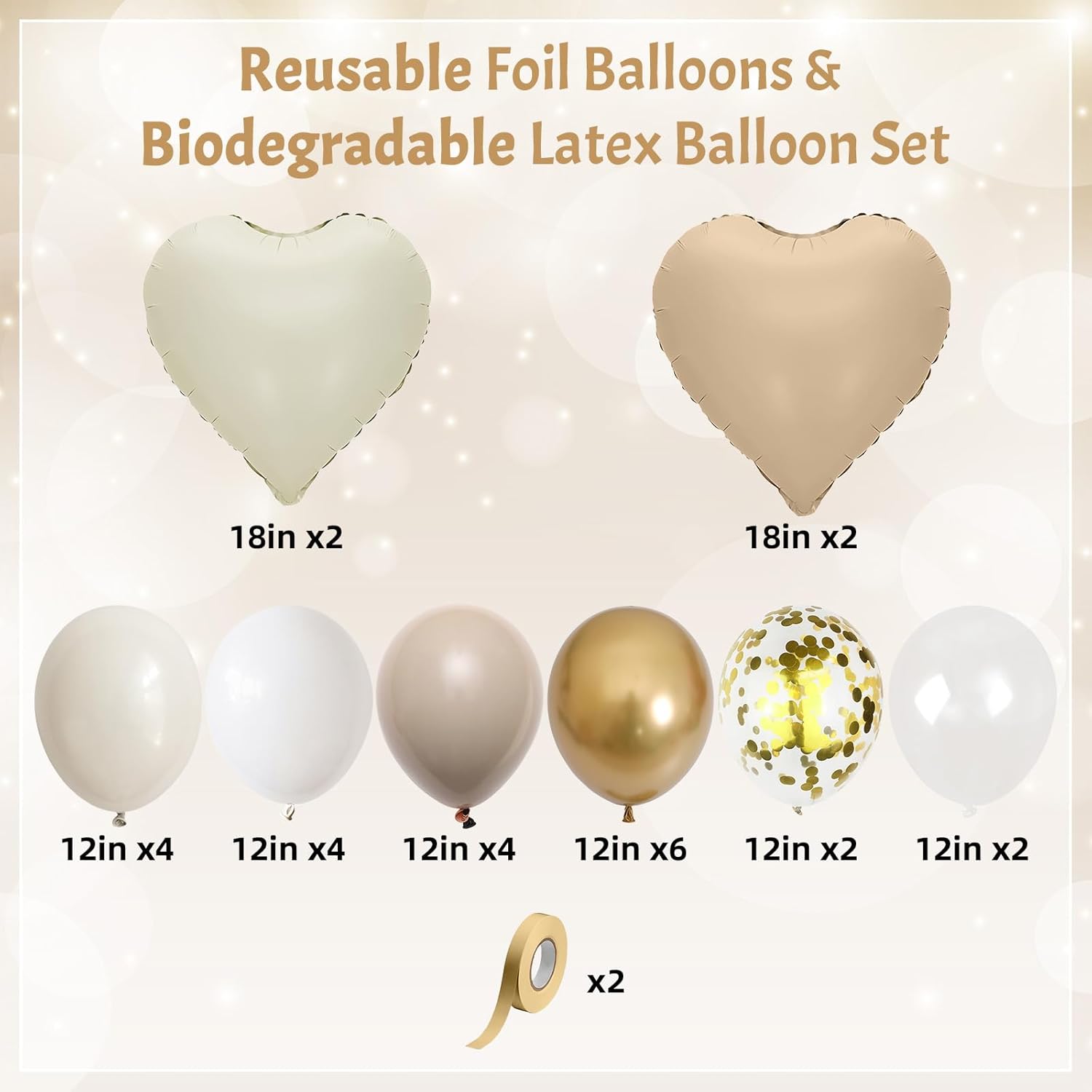 • 🥳【Heart Balloons Set - Exquisite Party Decoration】: 🤍 Cream Heart-Shaped Foil Balloons (18-in x 2), 🤎 Caramel Heart Balloons (18-in x 2), ✨ Metallic Gold Balloons (12-in x 6), ✨ Gold Confetti Balloons (12-in x 2), 🖤🤎 Apricot Double Layered Balloons (12-in x 4), ⚪ Sand White Balloons (12-in x 4), White Balloons (12-in x 4), Transparent Balloons (12-in x 2), 🎗Gold Ribbon 10M x 2. Exclusive color matching by the stylist, soft and tranquil colors.