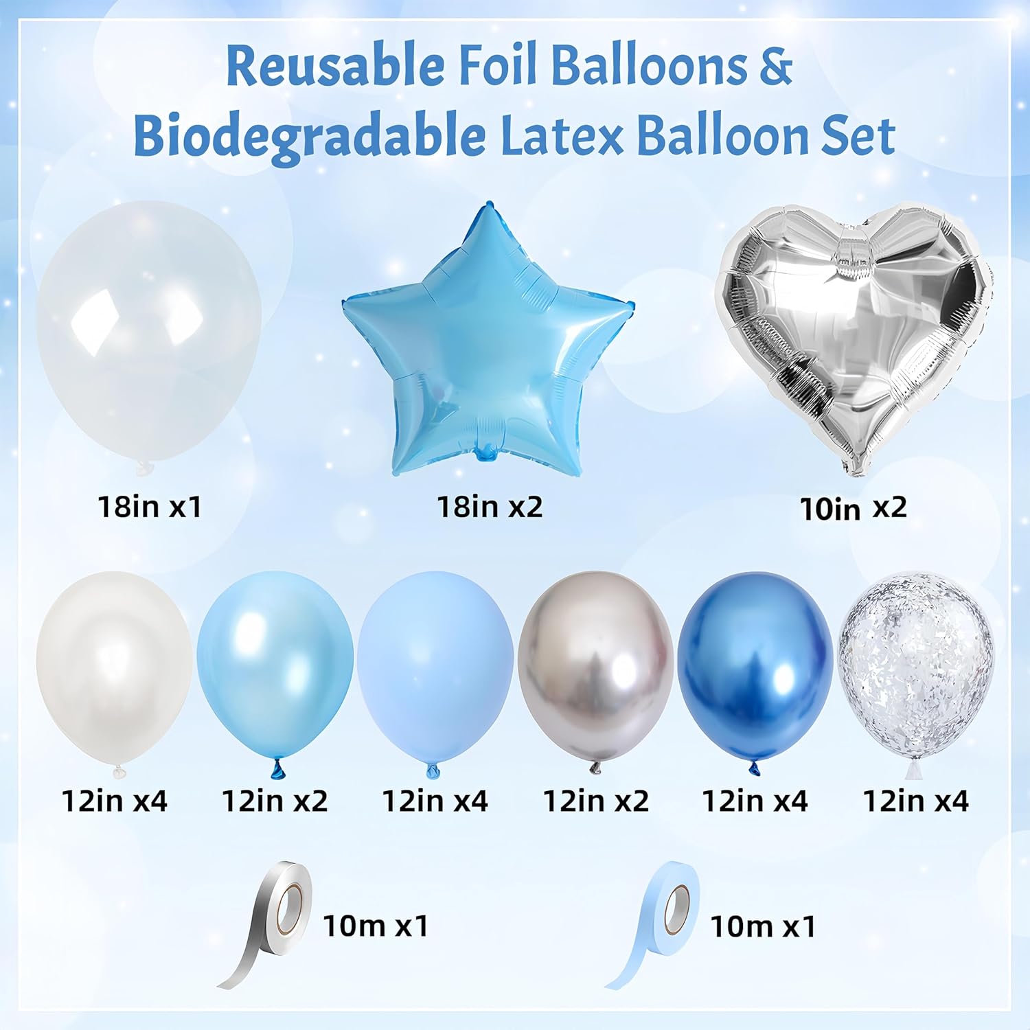 • 🥳【Heart Star Balloons Set - Exquisite&Unique Party Decor】:Light Blue Star Foil Balloons (18-inch x 2), Silver Heart Foil Balloons (10-inch x 2), Transparent Clear Balloon (18-inch x 1), Silver Confetti Balloons (12-inch x 4), Metallic Silver Balloons (12-inch x 2), Metallic Blue Balloons (12-inch x 4), Pearl White Balloons (12-inch x 4), Pearl Light Blue Balloons (12-inch x 2), Macaron Blue Balloons (12-inch x 4), Ribbons (Light Blue x 10 M, Silver x 10 M).