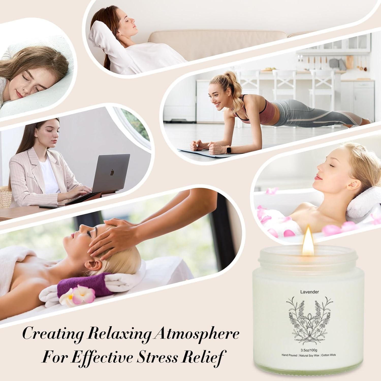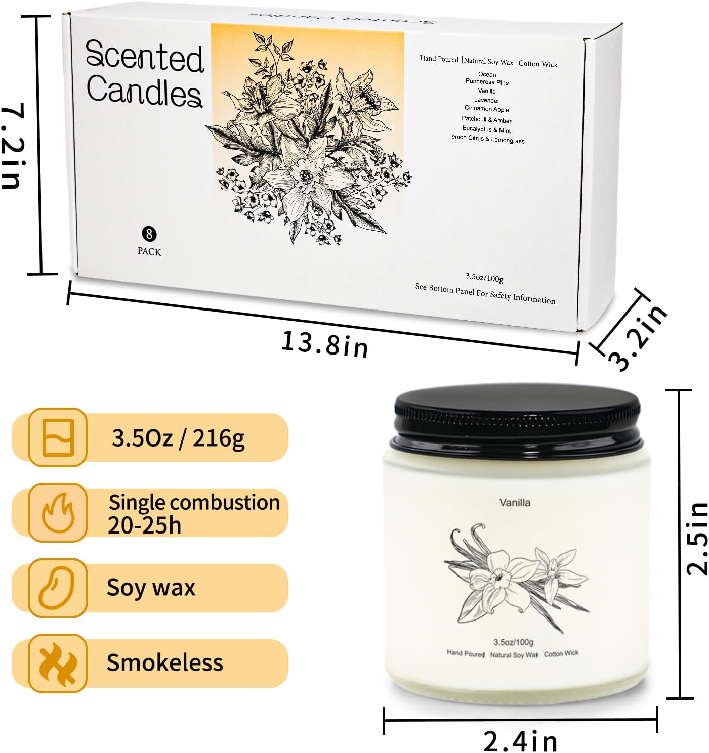 • 8 Pack Candles Set: Our aromatherapy candles set has 8 different scents, Cinnamon apple,Eucalyptus Mint,Lavender,Lemon Citrus&Lemongrass,Vanilla,Ocean,Ponderosa Pine,Patchouli&Amber scents.each of which exudes a unique scent, Familiar and pleasantly scented candles for stress relief, relaxation and improved sleep quality.