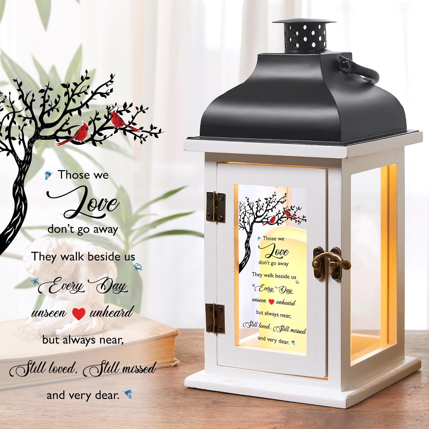 • Beautiful Memorial Lantern. Size: 14 x 5.8 x 5.8 inch. Made of solid wood with white paint. And the funeral lantern top is made of quality metal with black paint. The loop black metal handle is a great addition, assisting in carrying it around. The front acrylic panel features cardinal bird, tree and heart-touching words. Elegant, clear and never fades away.