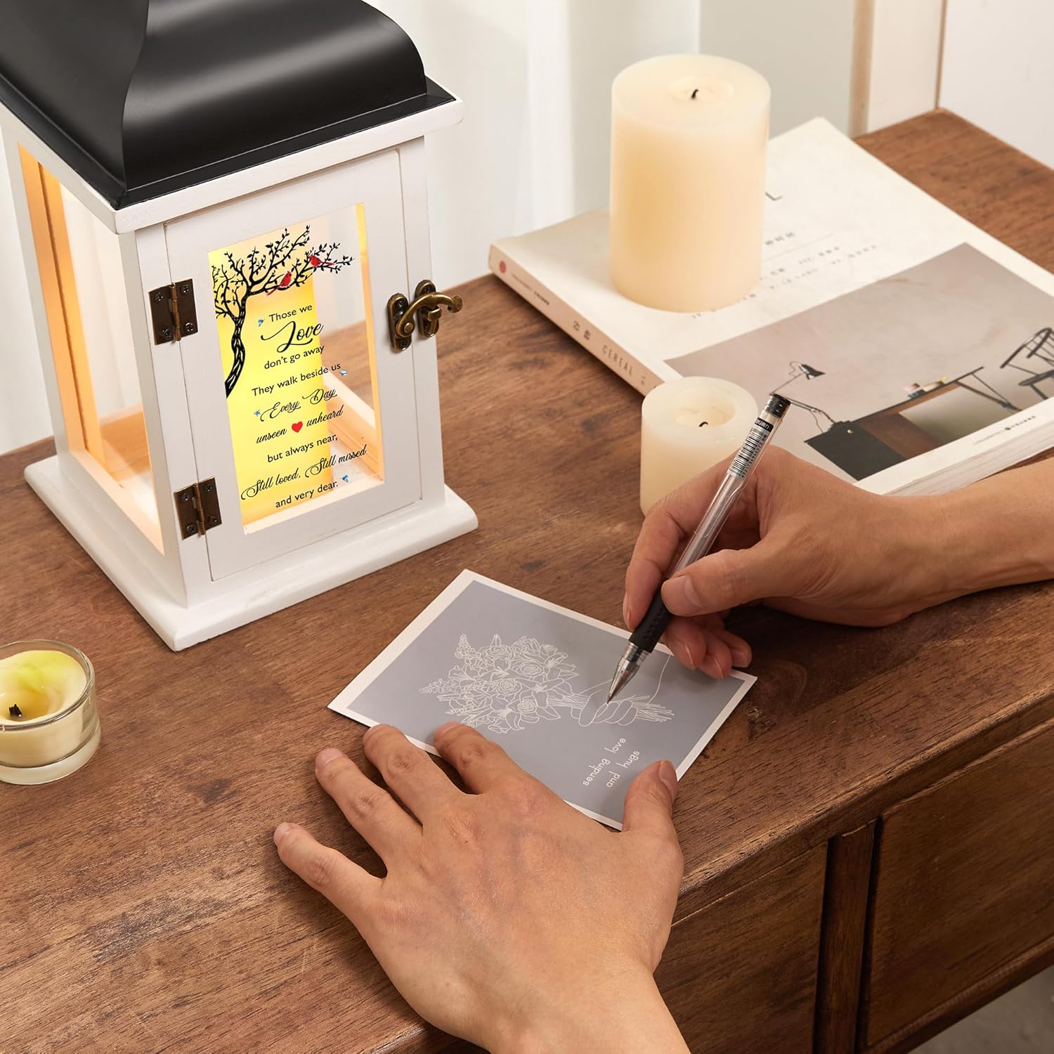 • Perfect Condolence Gift. This is an elegant way to provide comfort amongst the pain and grief of a loss and help find some peace for people in grief. When the Led candle is turned on, this beautiful memorial lantern brings some peace during a time of difficulty. It comes with a sympathy flowers packaging box. This is a thoughtful sympathy gift for grieving the loss of a loved one.