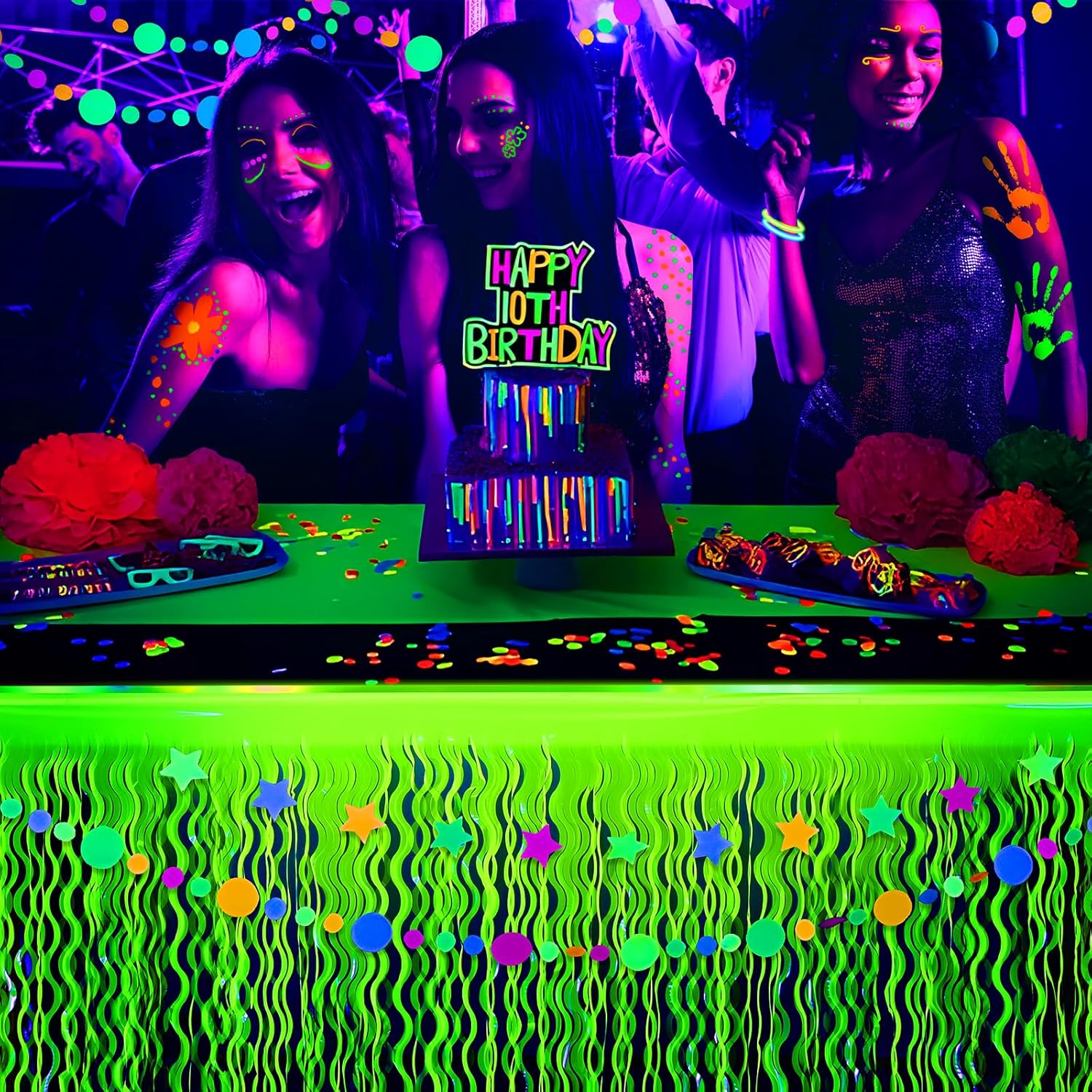 • 【 NEON PARTY DECORATIONS 】: Our unique neon fluorescent tinsel foil fringe table skirts are the perfect photo decorations for neon birthday party dessert table decorations. You will be immersed in the rich colors and glow in the dark party atmosphere they create.