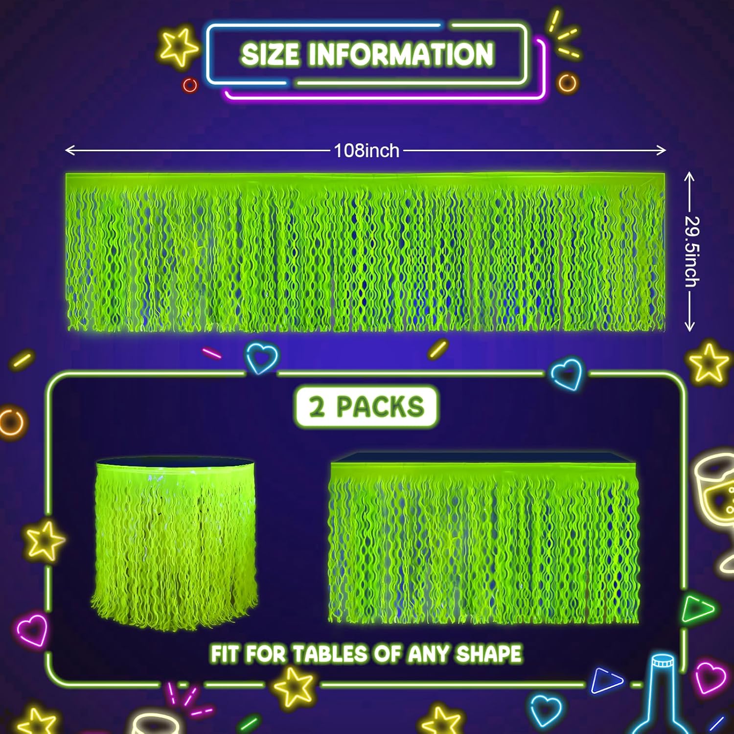 • 【 GLOW IN THE DARK PARTY SUPPLIES 】: 2 packs of neon fluorescent yellow foil fringe table skirts, extra large size (width x drop) 108 x 29.5 inches, perfect for neon birthday party decorations.