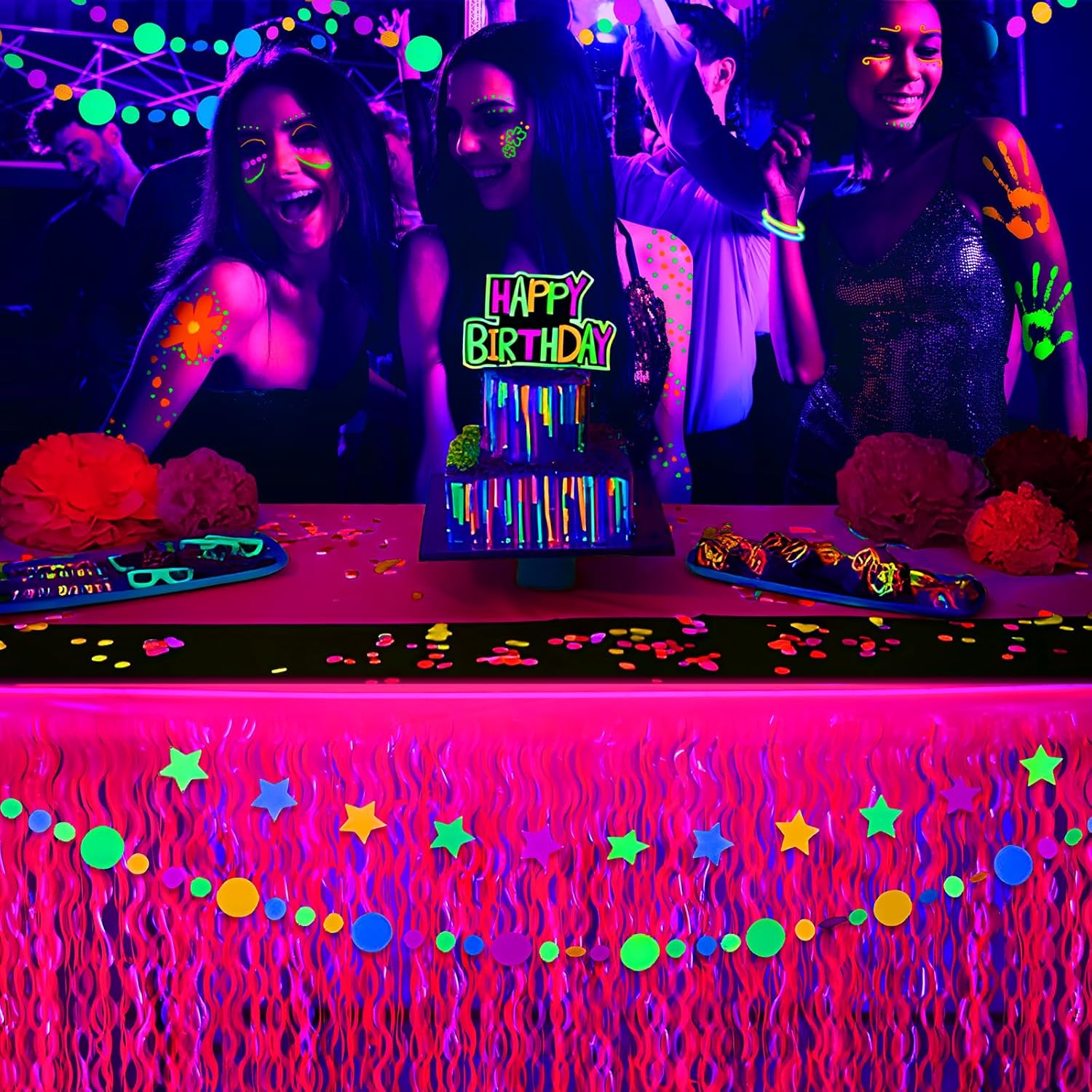 • 【 NEON PARTY DECORATIONS 】: Our unique neon fluorescent tinsel foil fringe table skirts are the perfect photo decorations for neon birthday party dessert table decorations. You will be immersed in the rich colors and glow in the dark party atmosphere they create.