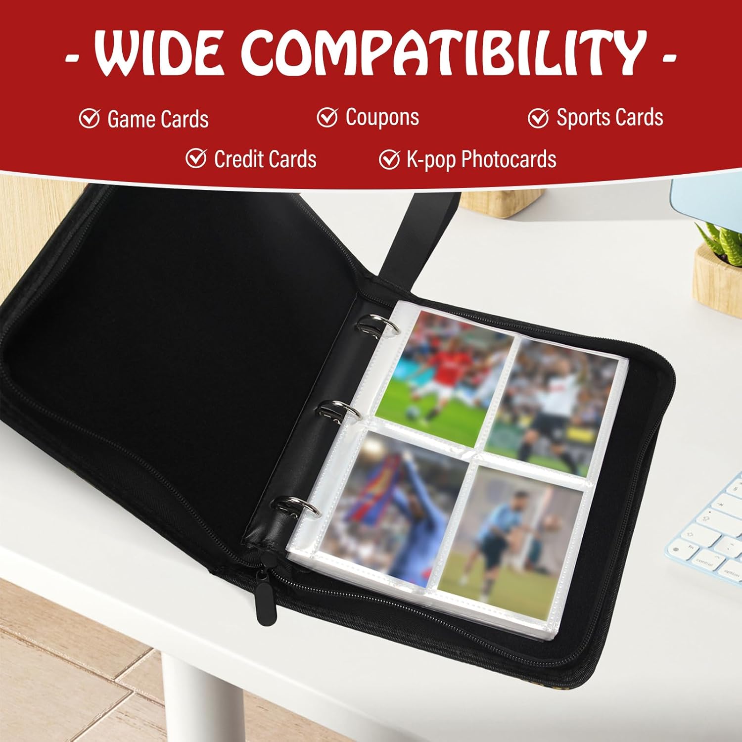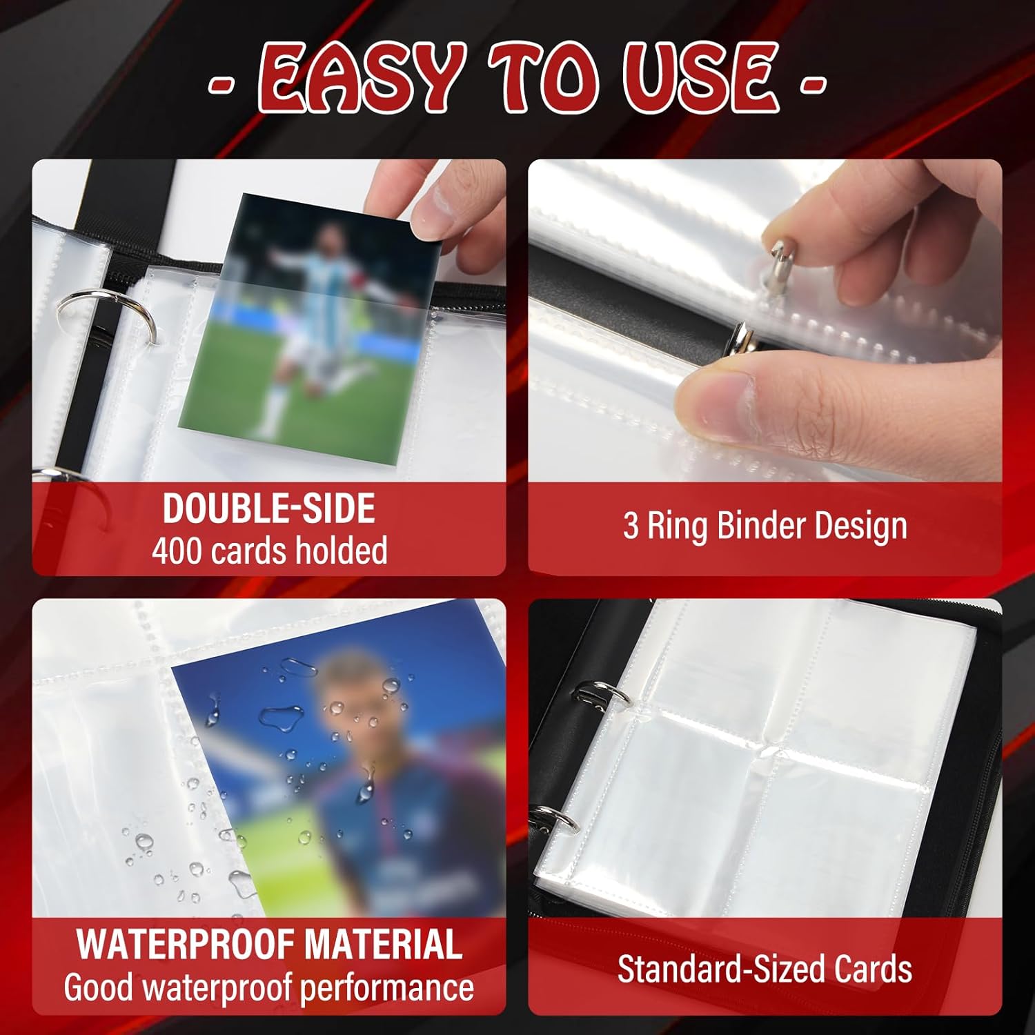 • Large Capacity Size: Inside page size: 2.68*3.5in,The card binder comes with 50 removable sleeves, which can hold up to 400 trading cards with 4 pockets on each side, allowing you to store cards on both the front and back.The trading card binder case is compatible with svarious standard-sized cards, Game Card , Football cards, Baseball cards