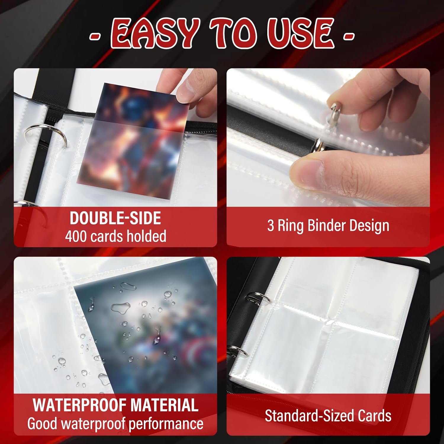 • Large Capacity Size: Inside page size: 2.68*3.5in,The card binder comes with 50 removable sleeves, which can hold up to 400 trading cards with 4 pockets on each side, allowing you to store cards on both the front and back.The trading card binder case is compatible with svarious standard-sized cards, Game Card , Football cards, Baseball cards