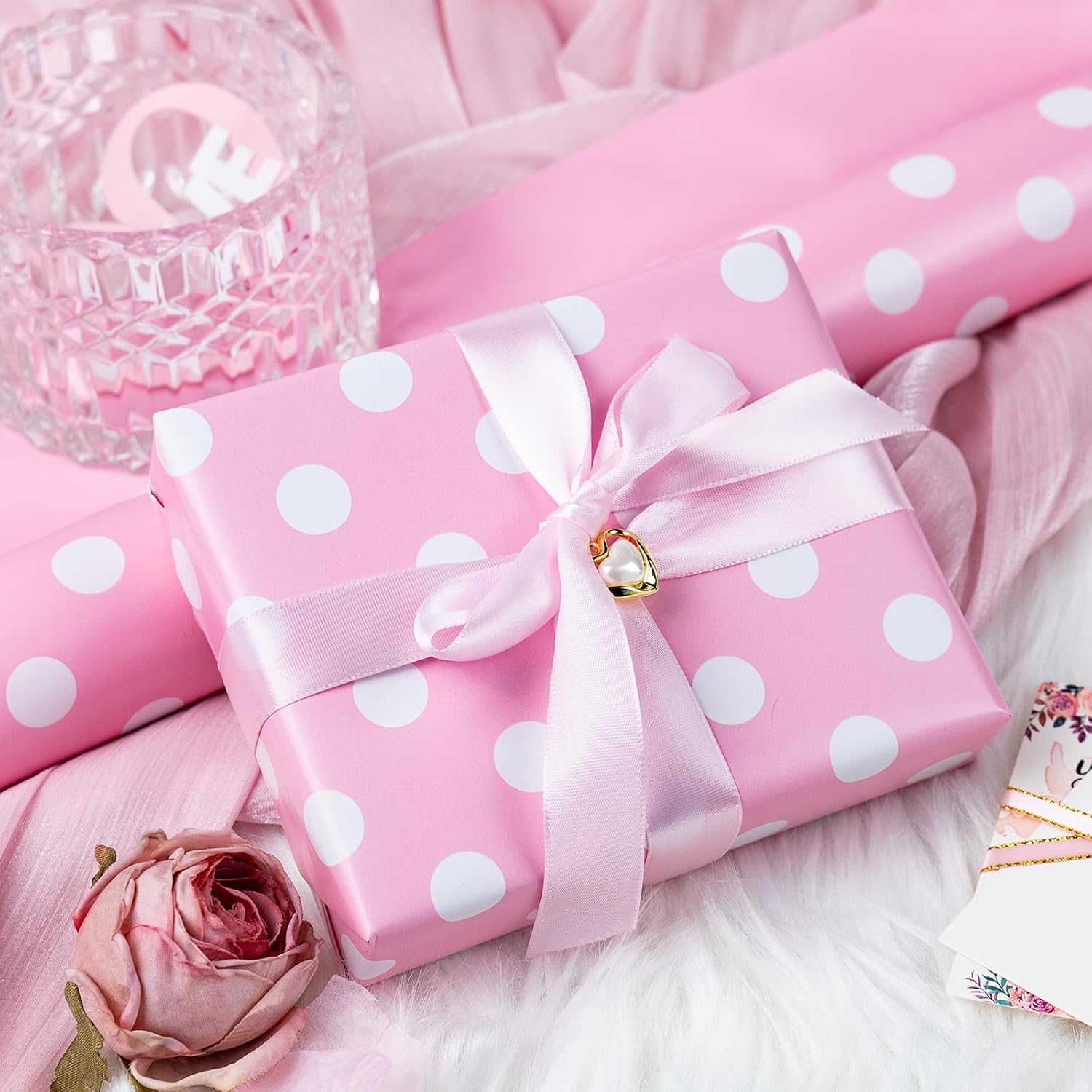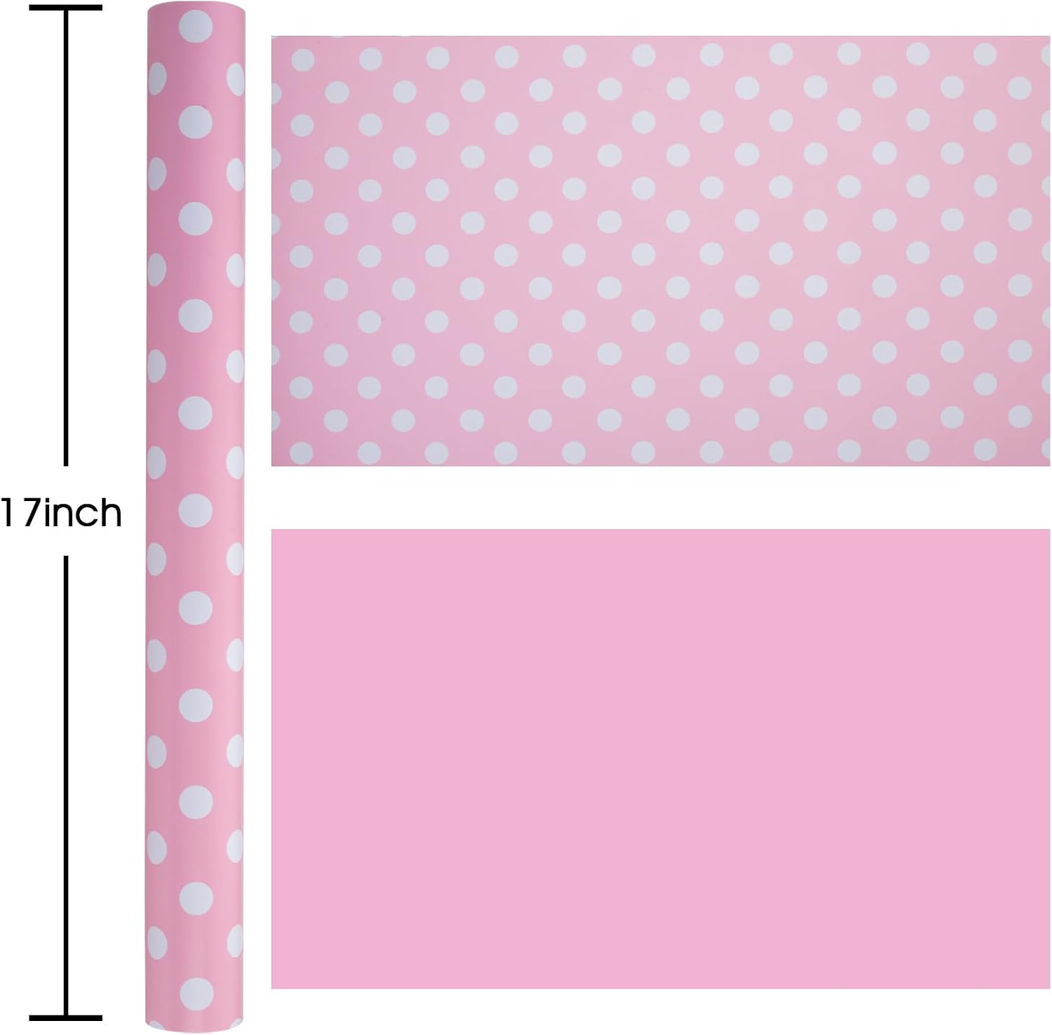 • Double-Sided Wrapping Paper: One side has pink and white polka dots, and the other is solid pink, making your gift wrap both fun and elegant