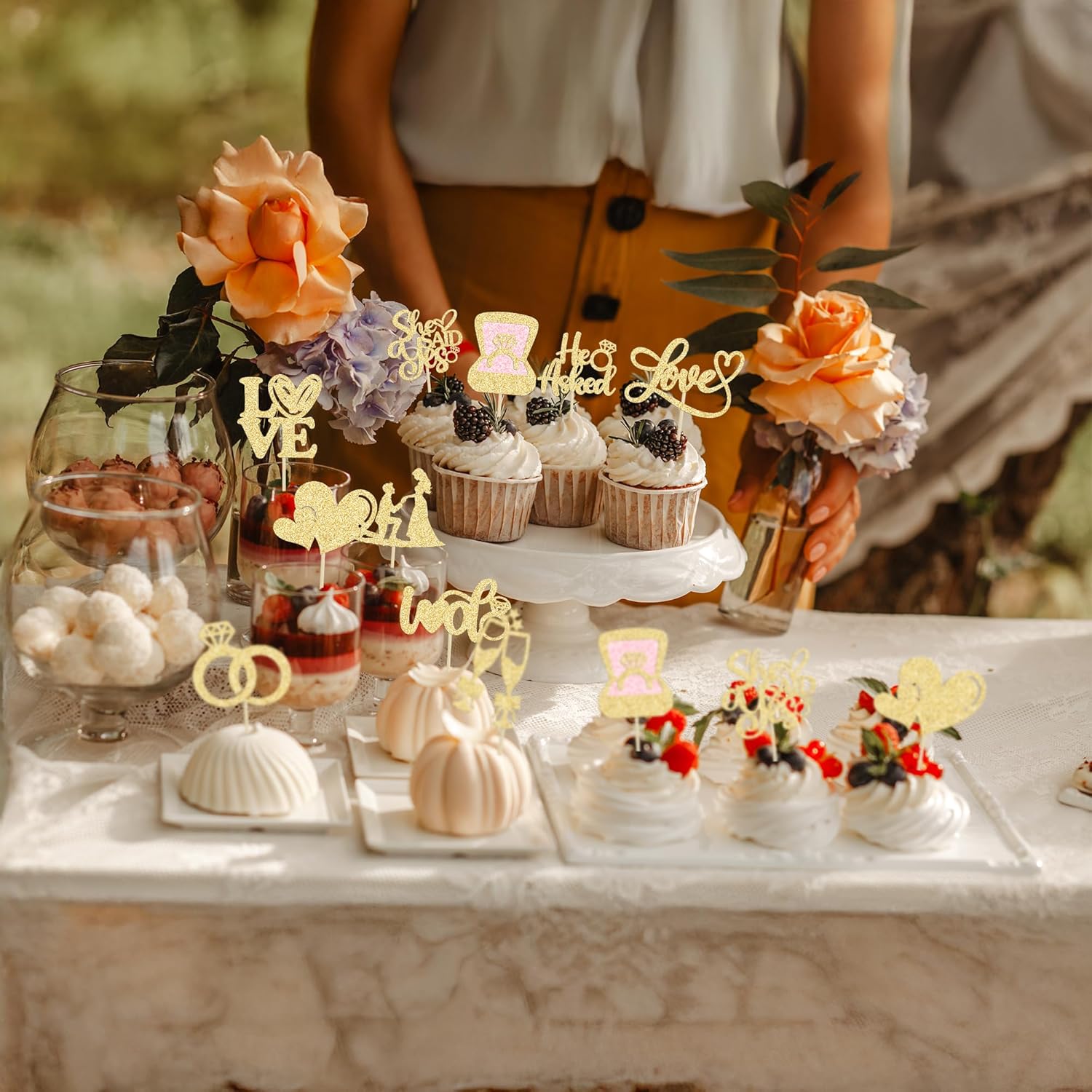 Ephlyn 30Pcs He Asked She Said Yes Cupcake Toppers Glitter Engagement Cupcake Toppers Diamond Ring Heart Love I Do Cupcake Picks for Engagement Wedding Party Cake Decorations Gold