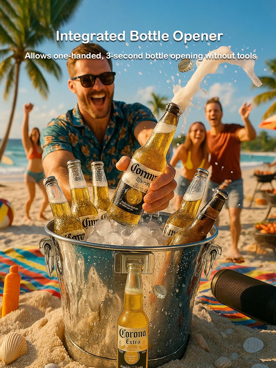 • 【Integrated Bottle Opener & Anti-Slip Base】 Built-in opener on the bucket body allows one-handed, 3-second bottle opening without tools. The concave base prevents the ice bucket from slipping due to condensation, which helps to place the beverage firmly.