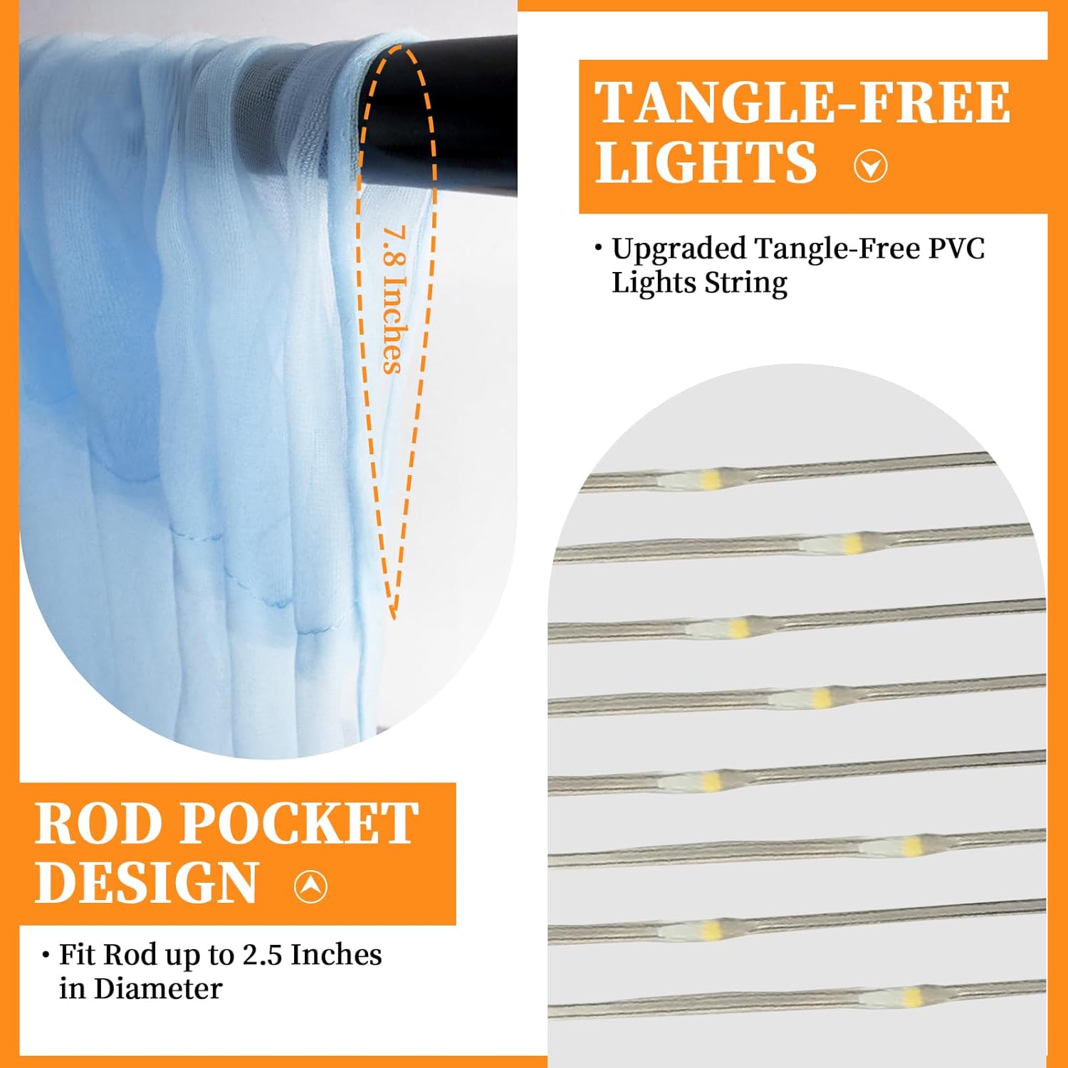 • Easy Setup & Reusable Decor: Designed for convenience, the tulle curtain features a 2.5-inch rod pocket for easy hanging on pipes or stands. Includes 12 Transparent clips make the lights simple to hang and secure to the backdrop, adding a warm, inviting glow. Reusable and easy to store, this set is perfect for multiple events