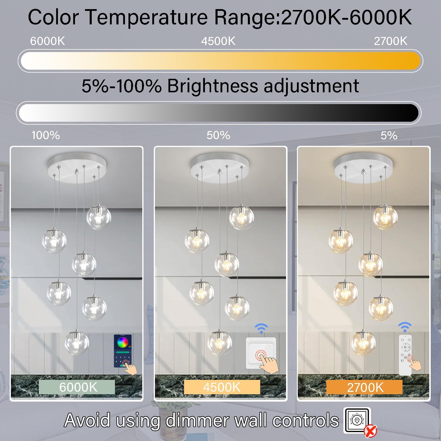 • 【Smart LED Chandelier 】It is equipped with a remote control and APP control for seamless dimming between warm white (2700K) and cold white (6000K), as well as adjustable brightness ranging from 5 to 100 percent.