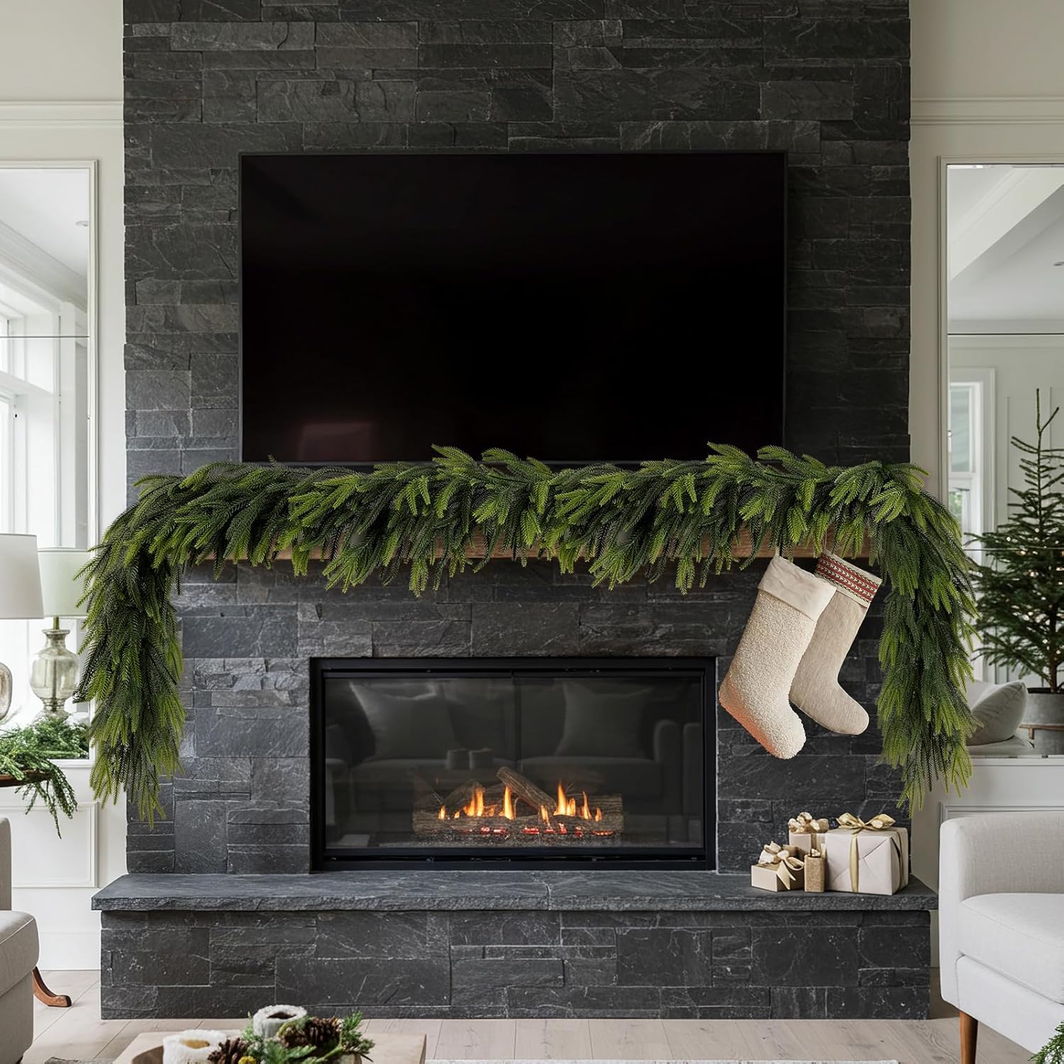 • Real Touch Norfolk Pine Garland: Each pine needle on the artificial pine garland realistic transitions from light green to dark green, mimicking the color of Norfolk pine. No need to spend time on maintenance, xmas garland is always fresh and will not rot