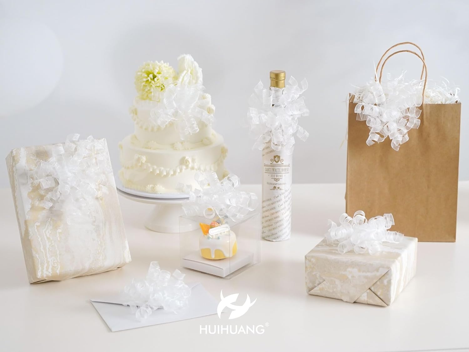 • SIZE & PACK: Each package contains 8 pcs white curly bows, and made from 12 strands of 3/8"(9mm) wide sheer ribbon that adds a light, airy, and luxurious feel to any gift or decoration. Bows measures 5"~5.5" wide, create a dramatic and burst effect, making it ideal for large gift boxes, baskets, and decorations