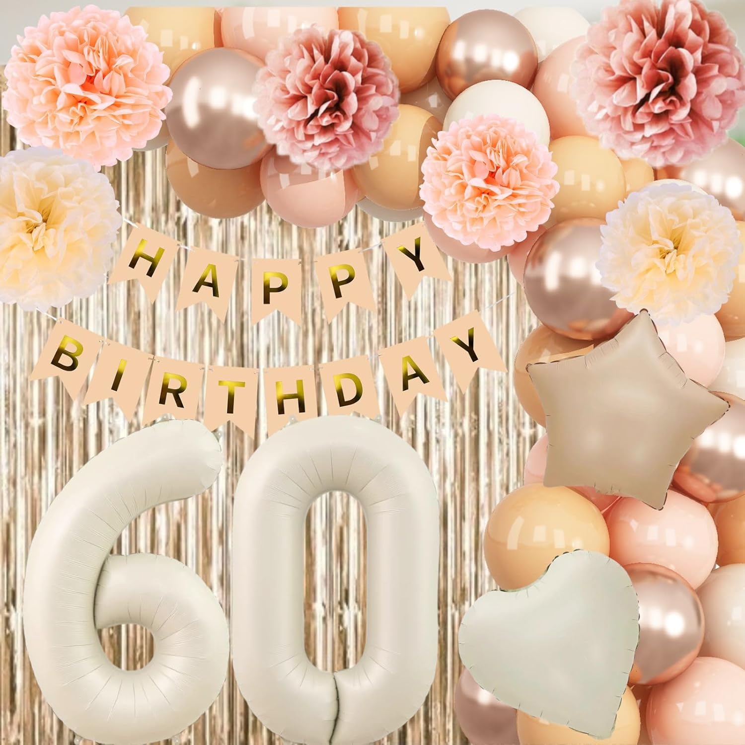 • PACKAGE INCLUDES: 1pc beige 60 number balloon, 1pc happy birthday banner, 2pcs dusty pink paper pom poms, 2pcs blush paper pom poms, 2pcs nude paper pom poms, 1pc champagne gold fringe curtain, 1pc caramel star foil balloons, 1pc cream heart foil balloons, 8pcs nude balloons, 6pcs blush balloons, 8pcs beige balloons, 4pcs champagne gold balloons, 1pc ribbon