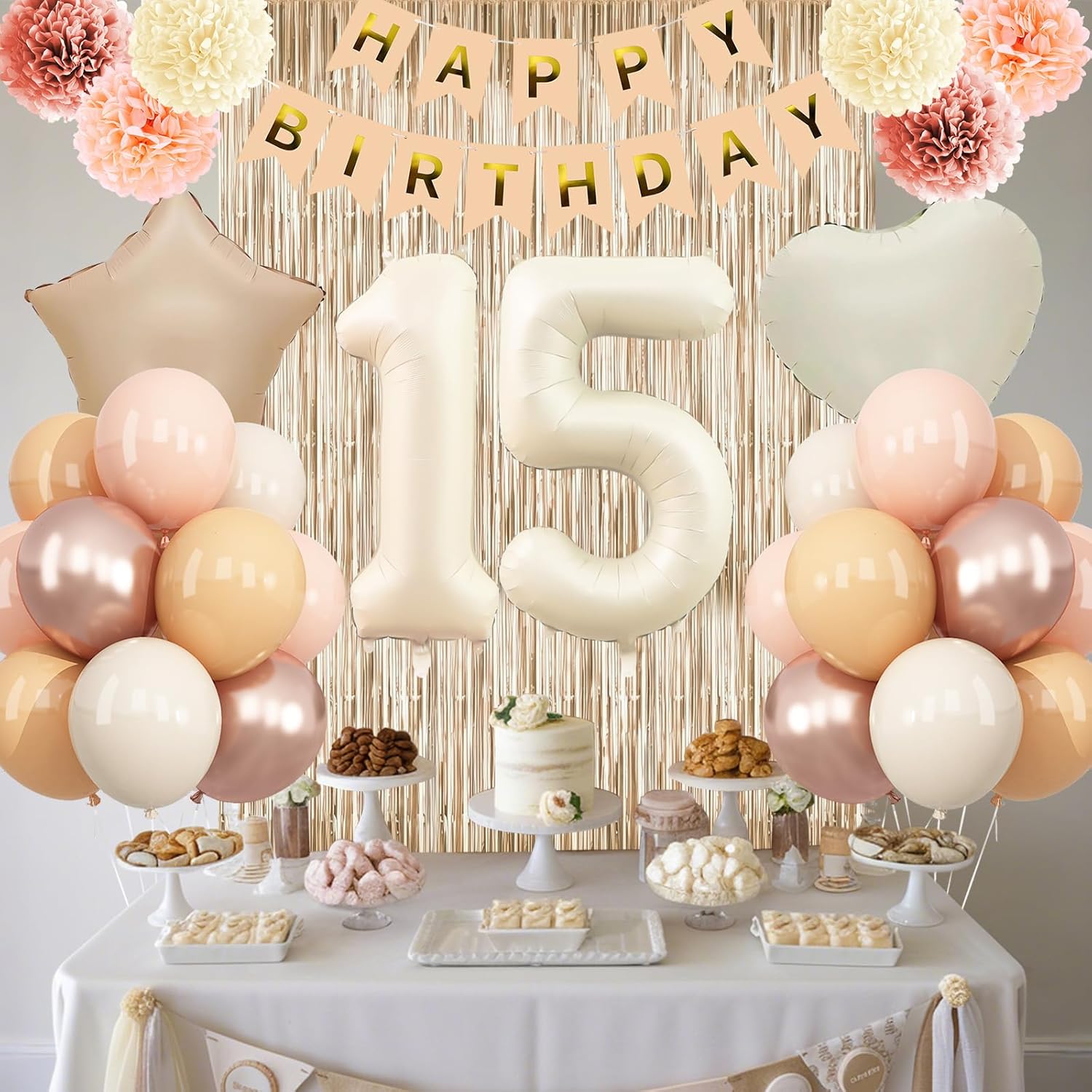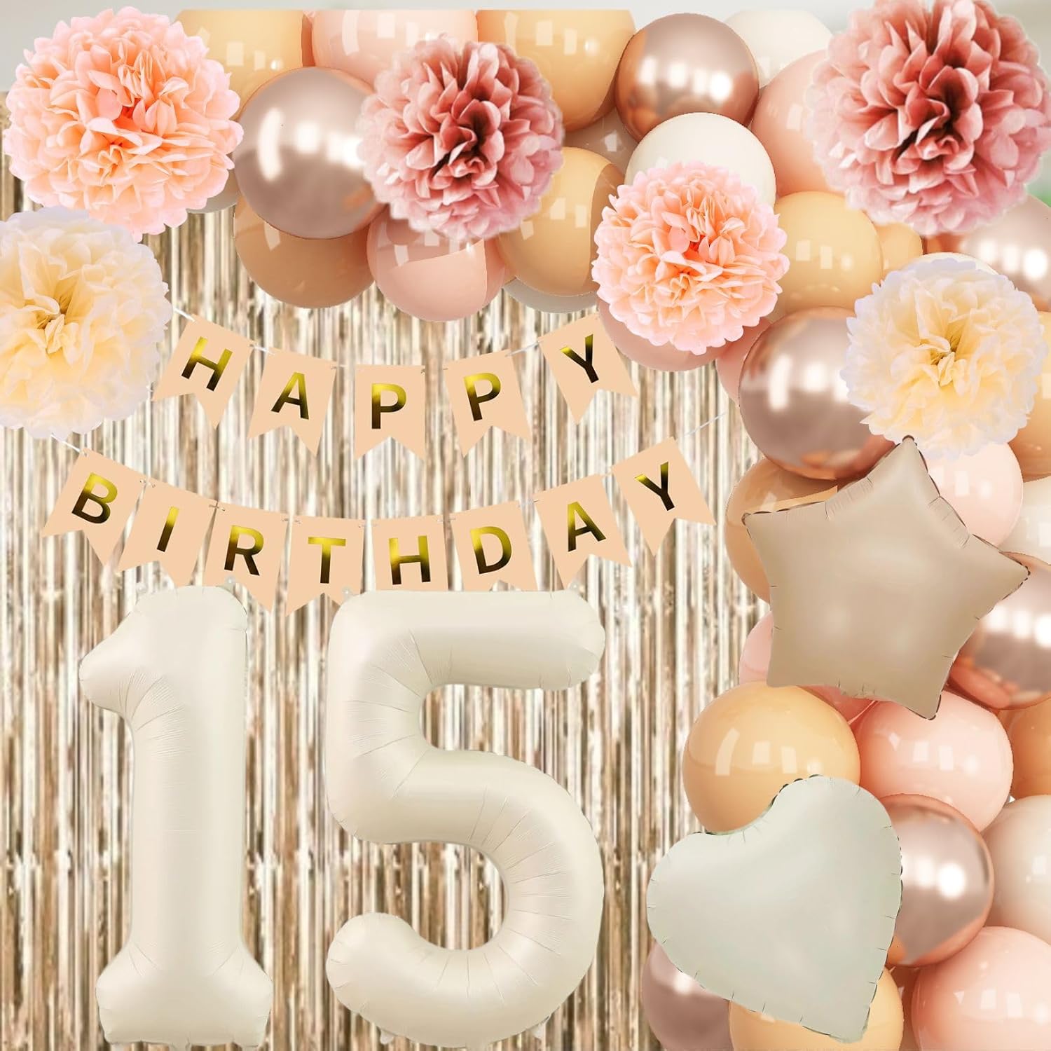 • PACKAGE INCLUDES: 1pc beige 15 number balloon, 1pc happy birthday banner, 2pcs dusty pink paper pom poms, 2pcs blush paper pom poms, 2pcs nude paper pom poms, 1pc champagne gold fringe curtain, 1pc caramel star foil balloons, 1pc cream heart foil balloons, 8pcs nude balloons, 6pcs blush balloons, 8pcs beige balloons, 4pcs champagne gold balloons, 1pc ribbon